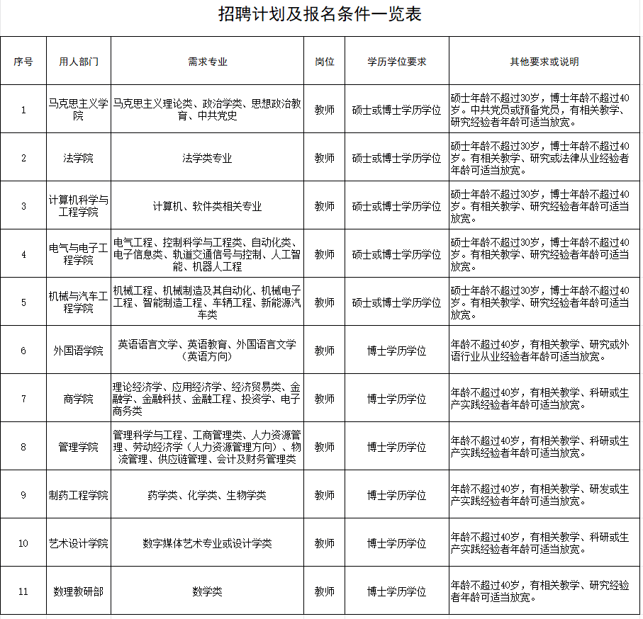 学校秉承开放式办学理念,广纳贤才,热忱欢迎高校优秀毕业生和各行业有志之士投身高等教育事业,到校工作。当前,学校蓬勃发展,办学规模日益扩大,根据教育教学工作需要,现招聘教师若干人,具体要求如下。