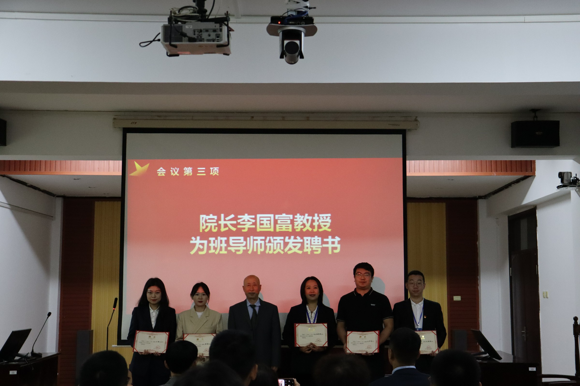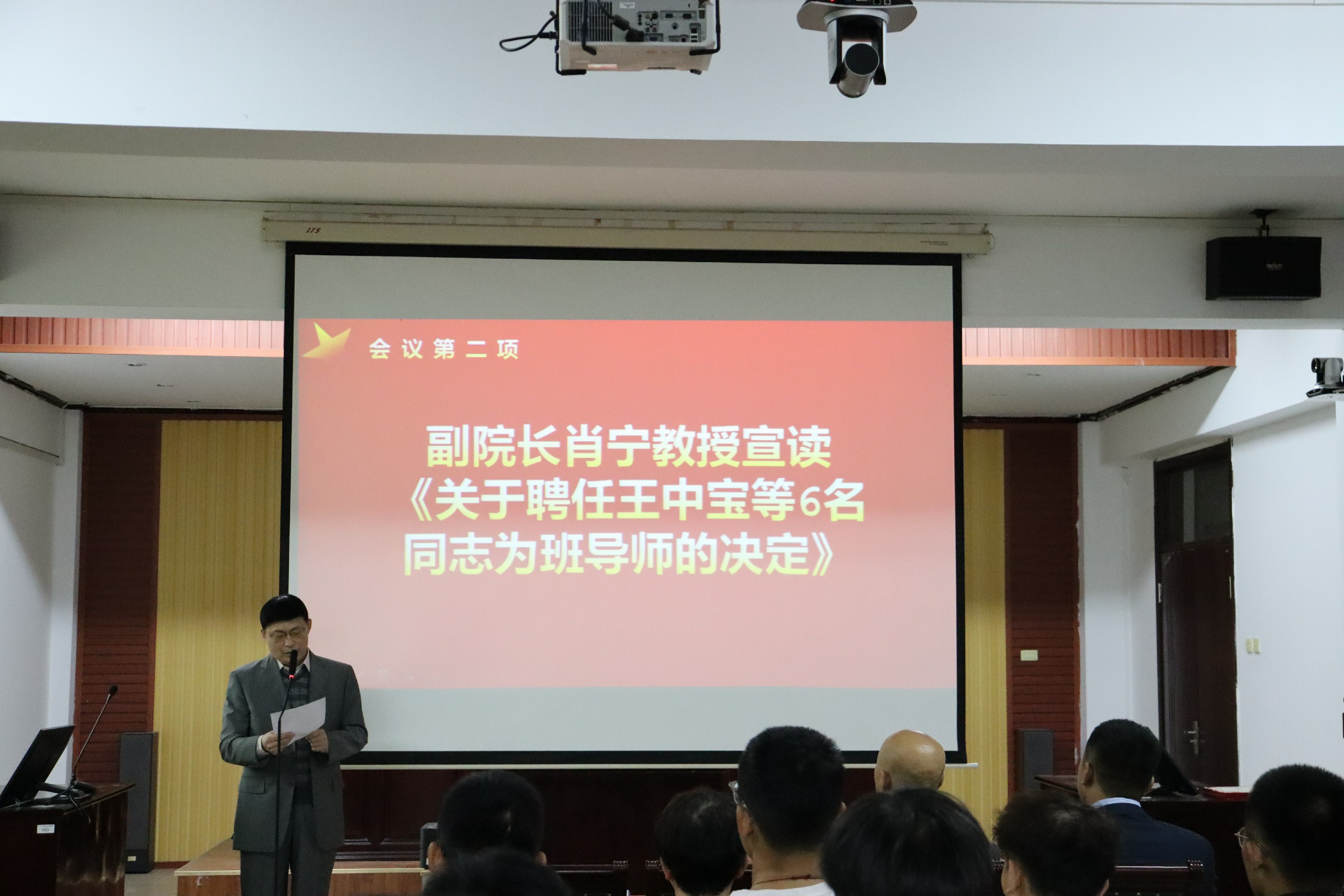 副院长肖宁教授宣读了《关于聘任王中宝等6名同志为班导师的决定》,聘任王中宝、王媛、刘海超、商铧文、付成斌、张鑫光六位同志为20、21级班导师。与会领导为受聘同志颁发了聘书,并对各聘任班导师同志给予更好助力学生成人、成才、成功的勉励。