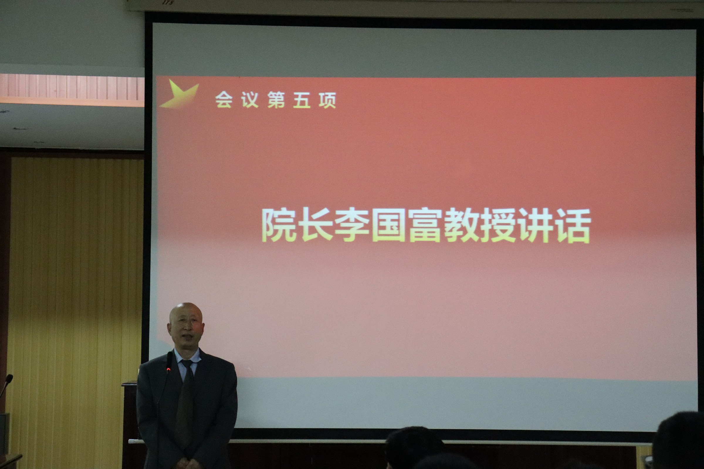 院长李国富教授发表讲话。他表示班导师制度是落实 “三全育人”工作的重要途径。该制度的真正落实在于每位老师的真诚付出,更在于每位学生的密切配合。希望各位班导师在今后的工作中真正做到以生为本,共同促进法学院在未来各项工作中更好发展。