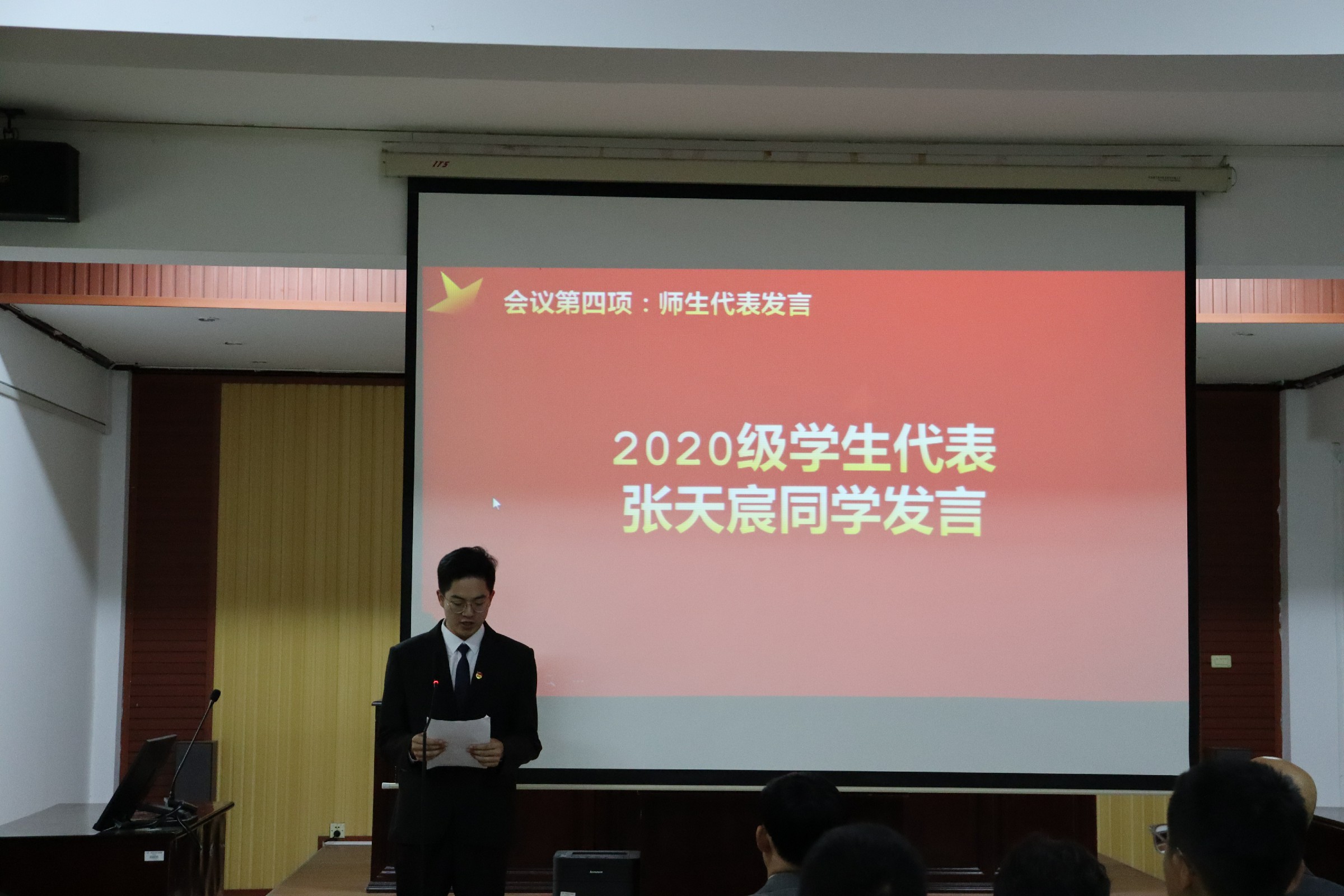 班导师代表王中宝老师发言,他表示将不负学院希望,认真履行班导师职责,并坚持与学院各老师协同合作、同频共振为引导学生成人成才而服务;2020级学生代表张天宸、2021级学生代表柳月分别发言。他们首先对各位班导师表示欢迎和感谢,同时承诺到,在未来的学习生活中积极配合班导师工作,不断强化自身能力,为成为新时代应用型法律人才不懈努力。