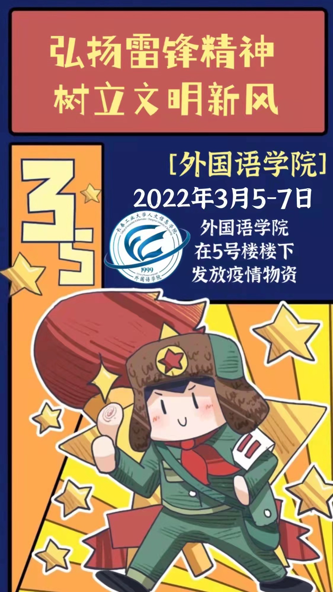 为了让雷锋精神充满校园,让青春的蓬勃气息洋溢,外国语学院将以“弘扬雷锋精神,树立文明新风”为主题,于3月5日-3月7日在五号宿舍楼下开展发放疫情防护物资的公益活动,为学生们免费发放防疫物资,欢迎有需求的同学们来领取。