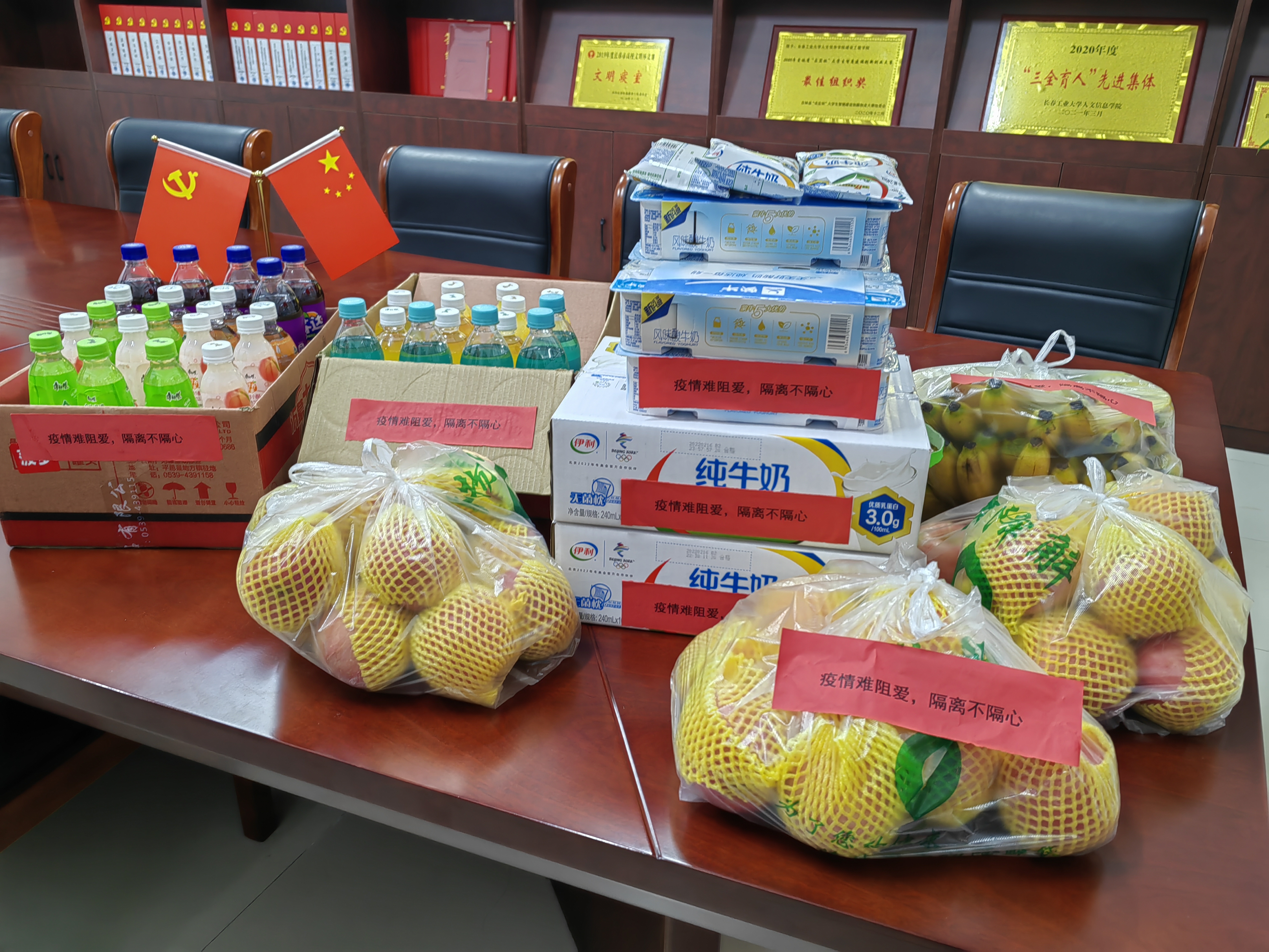 3月9日,在学院党总支的领导下,学院团委组织党员与学生干部开展了“疫情难阻爱,隔离不隔心”慰问活动,为隔离的同学们送上温暖。学院为隔离的同学采购了牛奶、水果、饮料等食品,鼓励隔离同学稳定心态,加强锻炼,保持积极向上的良好状态,让隔离的同学们感受到了“家”的温暖。