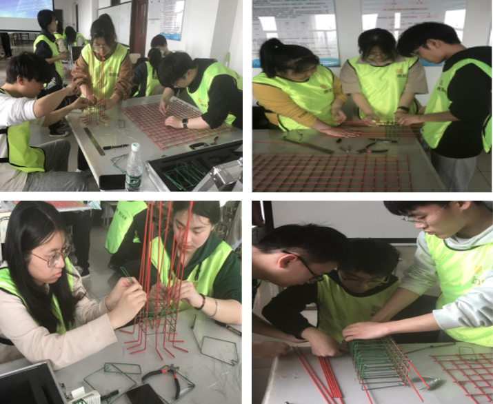 4月8日,源助教科技有限公司企业工程师在教4-316制图实训室和教4-511手工实训室分别进行了“平法识图、钢筋算量”理论学习和“方案编制、绑扎实操”内容培训和指导。通过预赛,在学院2020级、2021级工程造价、工程管理、土木工程、智能建造四个专业学生中选拔出9组共27人进入决赛。