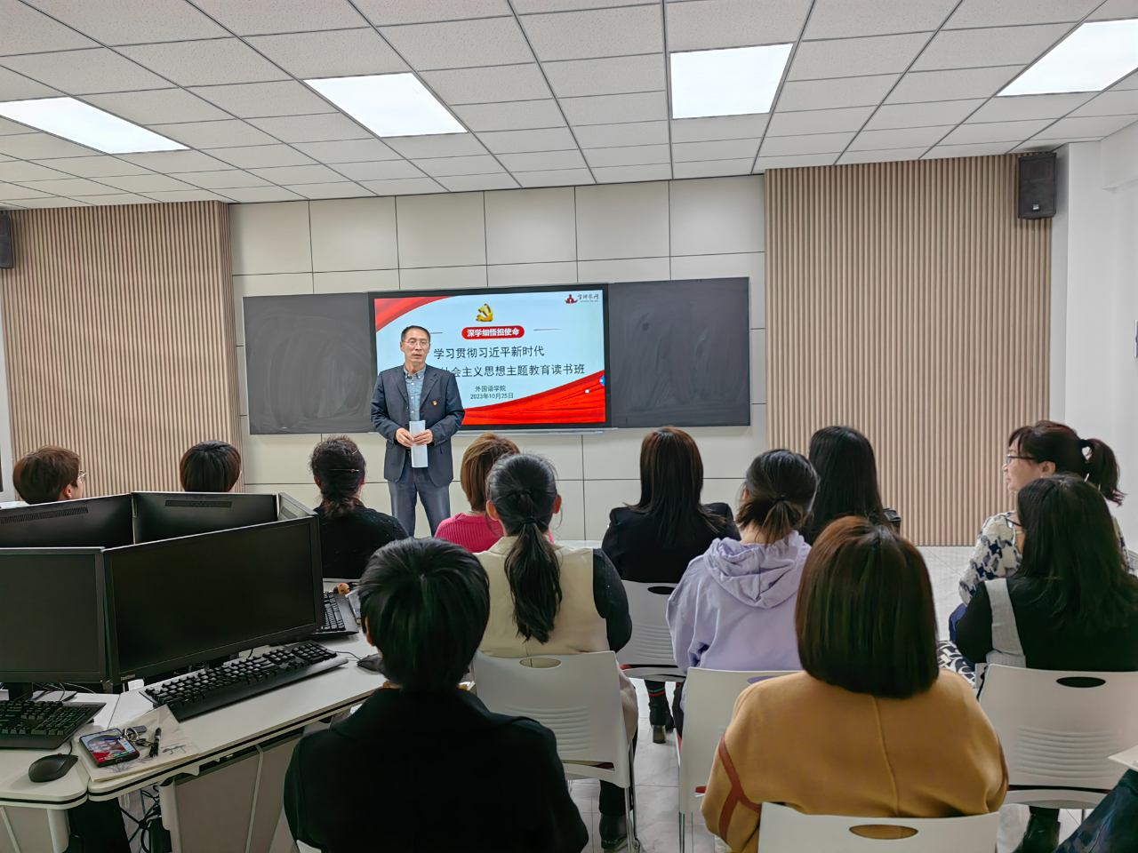 根据学校学习贯彻习近平新时代中国特色社会主义思想主题教育的部署要求, 10月25日下午外国语学院领导干部学习贯彻习近平新时代中国特色社会主义思想主题教育读书班正式开班。外国语学院党总支书记梁国东同志主持开班仪式并讲话。