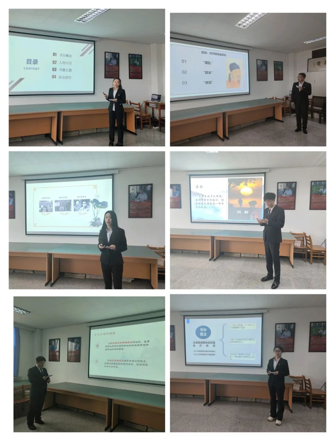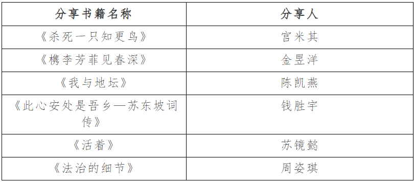 读书分享中,既有树立正确的人生观、价值观的《杀死一只知更鸟》,也有展示地方法治精神的《槜李芳菲见春深》;既有抓住希望,奏响生命颂歌的《我与地坛》,又有展示诗词之韵美的《此心安处是吾乡—苏东坡词传》;既有积极面对人生的《活着》,又有探讨法律、道德和公正问题的《法治的细节》。