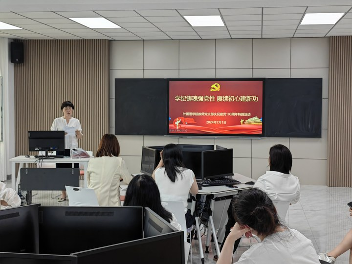 历史见证壮阔的征程,时间镌刻奋斗的足迹。从一叶红船到巍巍巨轮,中国共产党迎来成立103周年华诞。走过峥嵘岁月,历经风雨洗礼,百年大党风华正茂;永葆赤子之心,砥砺复兴之志,千秋伟业气势如虹。在 7 月 1 日这个重要的日子, 外国语学院教师党支部全体党员集聚一堂,开展题为“学纪铸魂强党性 赓续初心建新功”的特别活动,庆祝中国共产党成立103周年。
