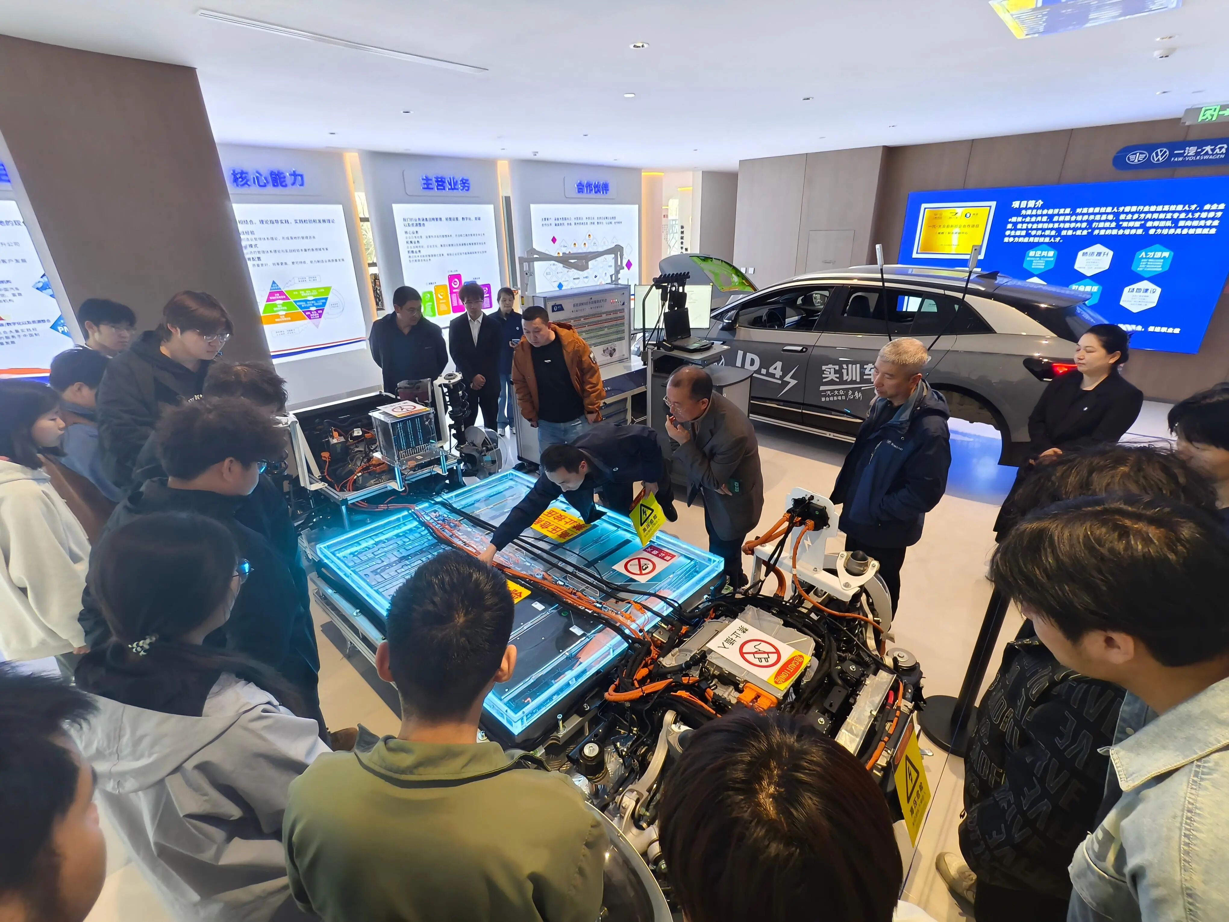 从新能源汽车实训设备的研发制造,到行业前沿技术的应用落地,企业培训教师结合企业实际案例,为学生们细致讲解了新能源汽车产业的发展趋势、岗位能力要求与技术迭代方向。学生们认真聆听、仔细记录,不时就专业学习、技术细节、职业发展等问题积极提问,在互动交流中深化了对专业的认知,真切感受到了行业的蓬勃活力。