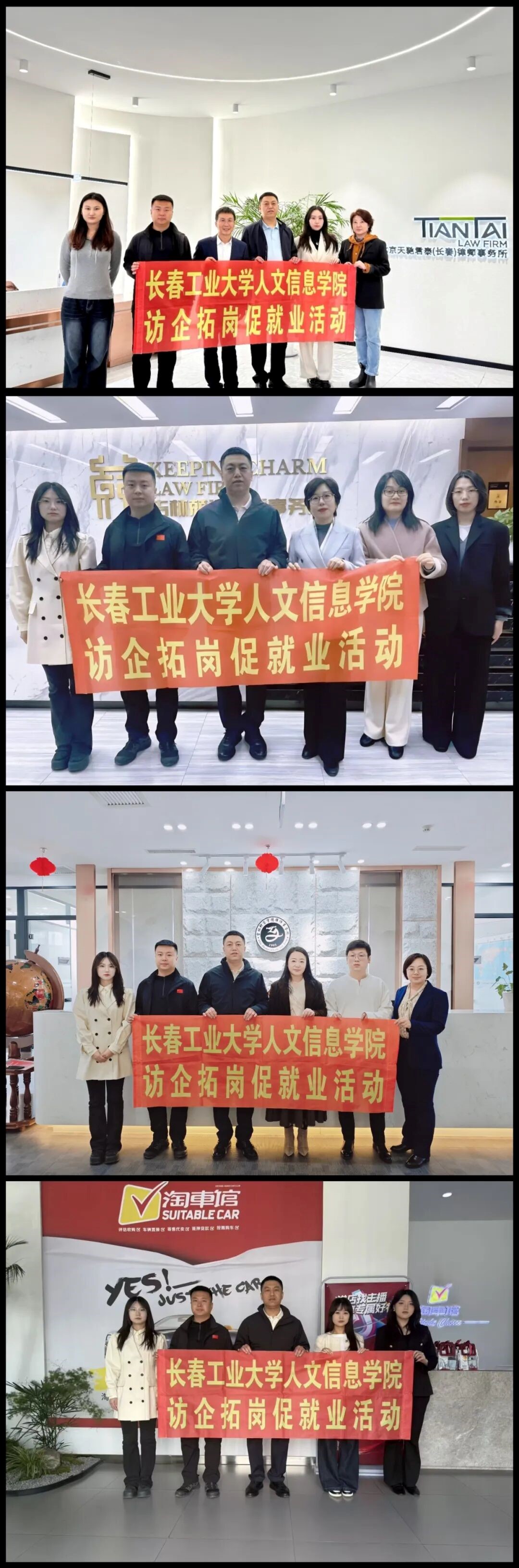 为深入贯彻落实高校毕业生就业工作部署,深化产教融合与校企合作,精准对接行业与企业需求,近日,法学院副院长刘宁、团委书记周远航、辅导员张斯尧、陈慧盈晰先后走访了吉林兢诚律师事务所、吉林省钟言宇德律师事务所、北京天驰君泰(长春)律师事务所、吉林德勋律师事务所、长春市尊选汽车科技服务有限公司五家用人单位,开展访企拓岗促就业专项行动。