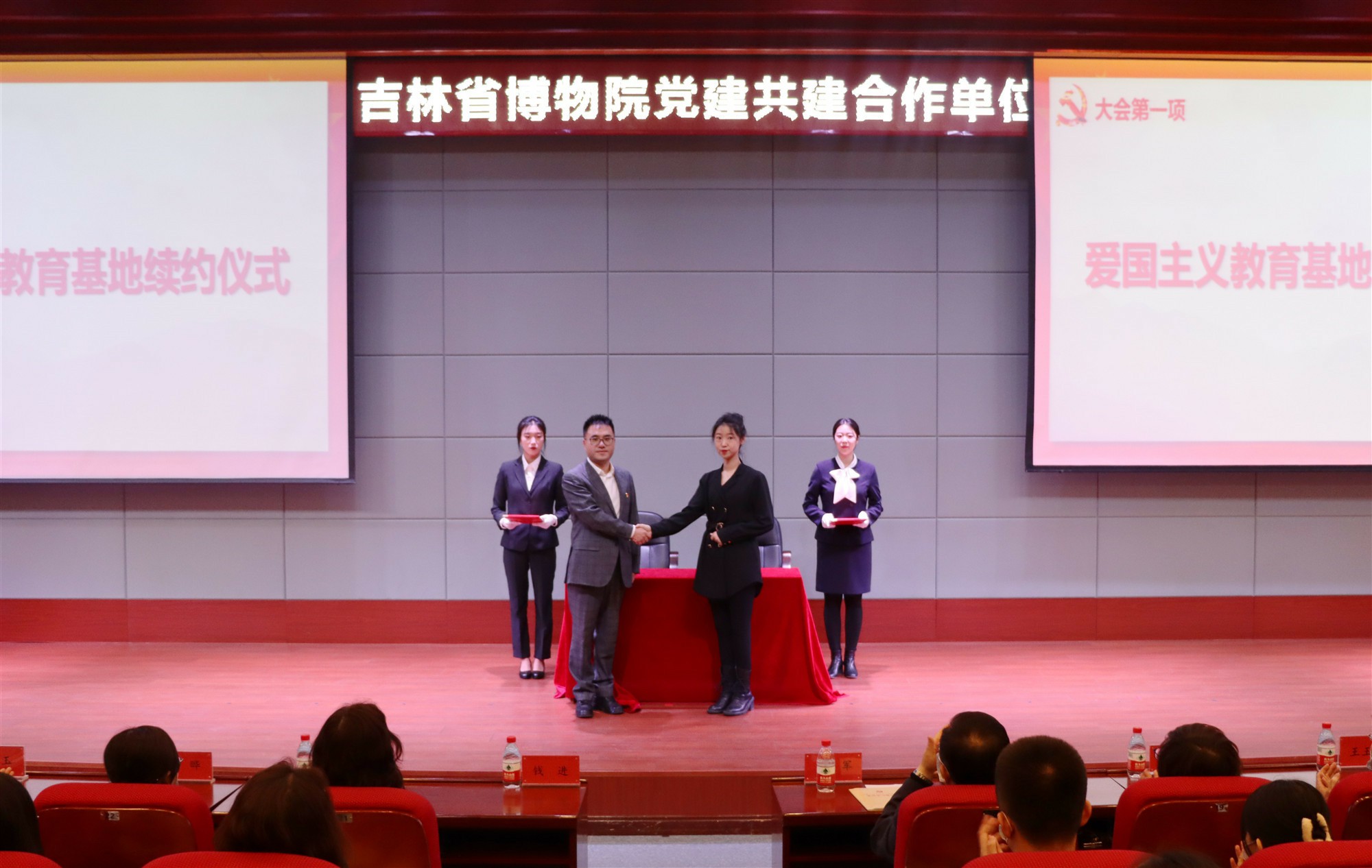 会上,吉林省博物院公众服务部副主任刘梦娇与建设工程学院党总支书记徐辉签署“爱国主义教育基地”续约协议。