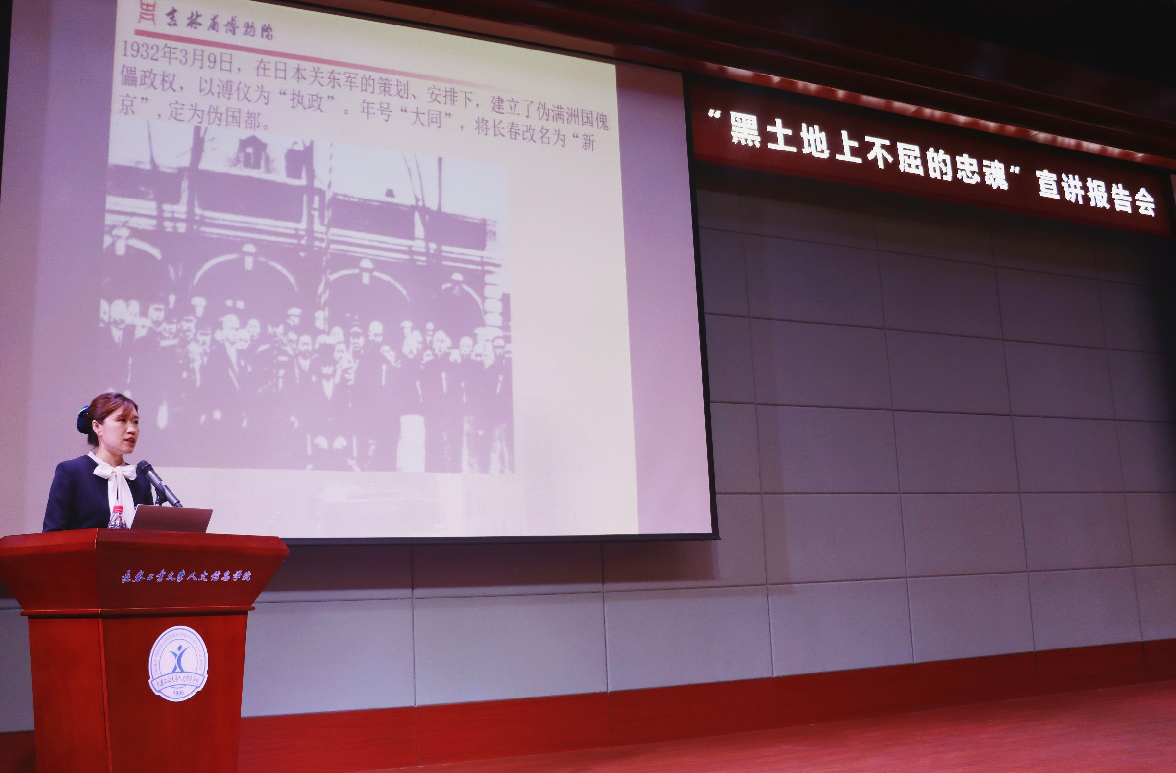 吉林省博物馆讲解员崔玉卓同志作题为“黑土地上不屈的忠魂”的专题报告。