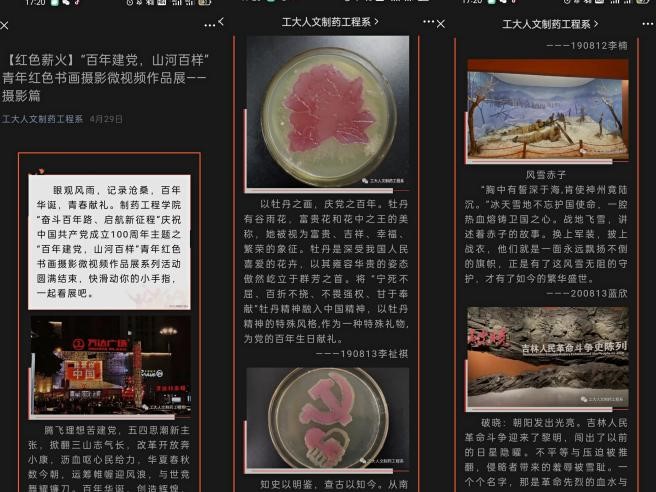 在庆祝中国共产党成立100周年之际,制药工程学院党总支为提升党员思想先进性,干事创业的担当性,一方面开展了制药工程学院党总支党史专题教育、师德师风专题教育、学院院长“五爱”专题教育、党员教师班主任活动以及党总支“六红”教育系列活动,即(上红色党课、读红色经典、观红色影片、赴红色基地、集红色征文、唱红色歌曲)等,以实际行动提升党员担当能力;另一方面强化思想觉悟,成绩业绩比出来,感恩奉献比起来,尤其是在狙击新冠疫情的关键时期,党员师生、骨干学生主动作为、奉献爱心,支援家乡疫情防护工作。党员师生积极参加学院搭建的奉献服务平台,为同学办实事,进行社会奉献服务活动,以实际行动践行初心和使命,教师党员周月同志经常教育学生说:“要保持对党的忠诚之心、对岗位的责任之心、对工作的进取之心、对学生的仁爱之心,牢记育人使命做好育人工作。”同时,学校党委领导亲临指导,助力制药工程学院党总支“三亮三比三争”活动蓬勃开展。