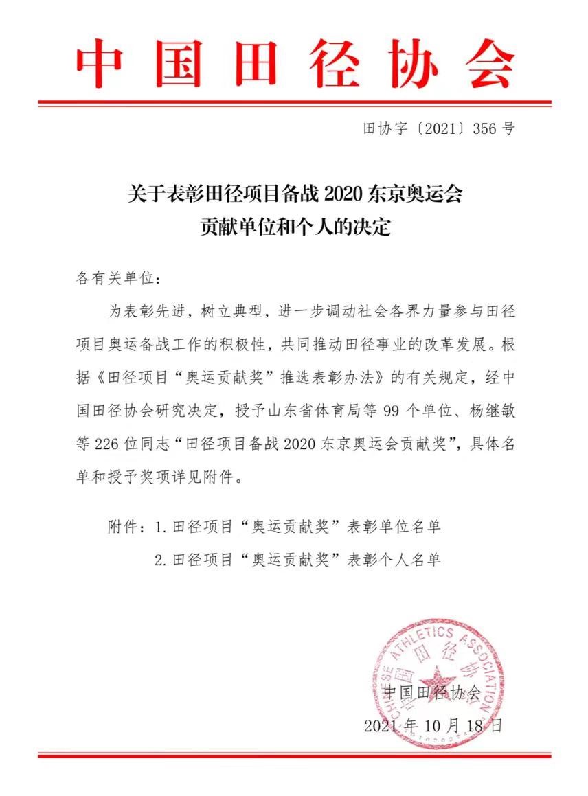我校体育教研部教师曹庆博,在中国田径协会发布的关于表彰田径项目备战2020年东京奥运会贡献单位和个人的决定中,荣获贡献奖。