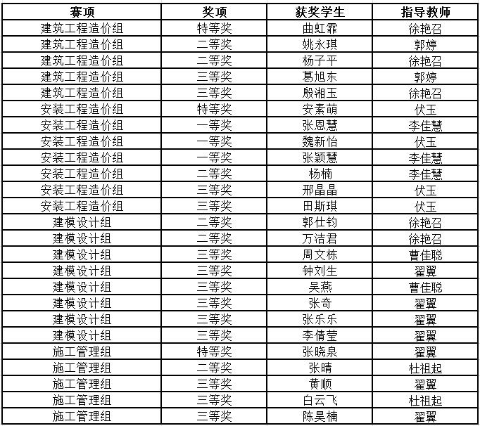 我校建设工程学院通过校赛选拔出51名学生代表学校参加本次大赛,荣获团体及个人奖项40项,包括:最佳组织奖1项,优秀指导教师8项,团组赛一等奖2项、二等奖1项、三等奖3项,单项赛特等奖3项、一等奖3项、二等奖6项、三等奖13项。