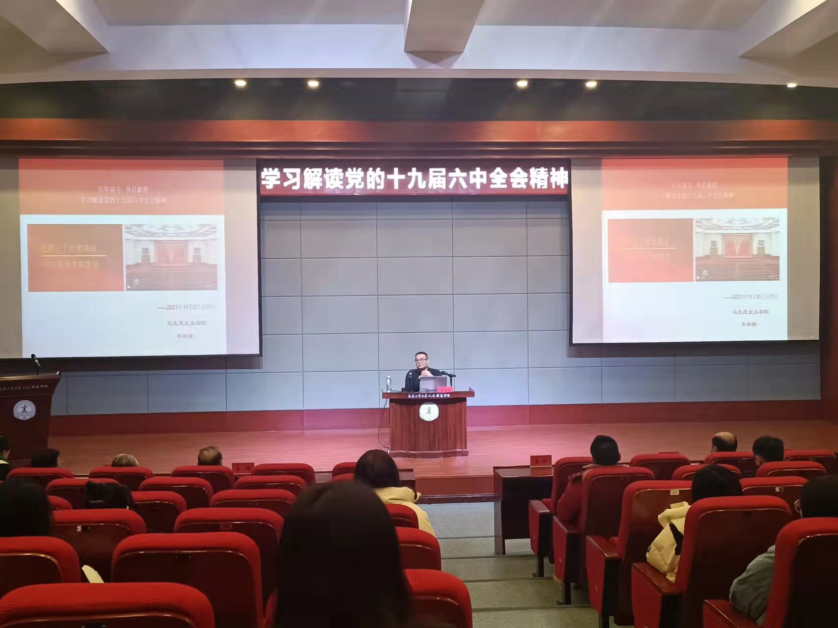 为深入学习贯彻党的十九届六中全会精神,第一时间将会议精神进课堂、进教材、进头脑,12月1日下午在学术报告厅,马克思主义学院参加团委组织的《学习十九届六中全会精神》专题报告会暨集体备课活动。马克思主义学院常务副院长李学锋教授作《学习党的十九届六中全会精神——党的三个“历史决议”与中国革命和建设》专题辅导。