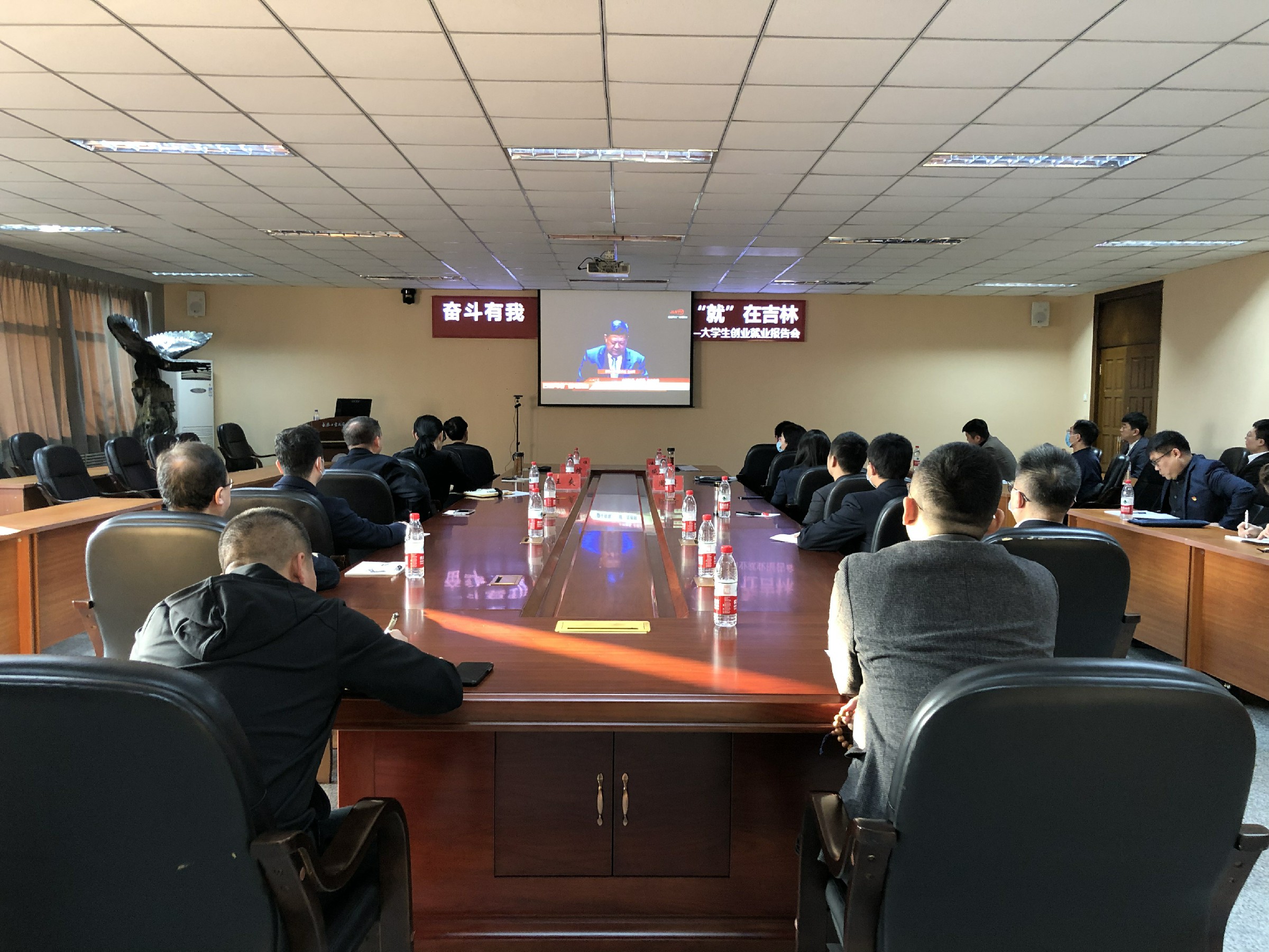 12月29日下午,学校组织师生在线收看“奋斗有我, ‘就’在吉林”大学生创业就业报告会,学校董事长张兆华,校长潘福林,党委书记王煊,副校长兼教务处长臧玉萍,党委副书记周丹,校长助理兼招生就业处长王爽,各学院德育办主任、招生就业处及就业创业教研部全体成员25人在学校三楼会议室参加集中收看。其他学校领导班子成员、各学院院长、就业指导教师、全体辅导员,及大三、大四全体同学在手机端参加线上直播收看。