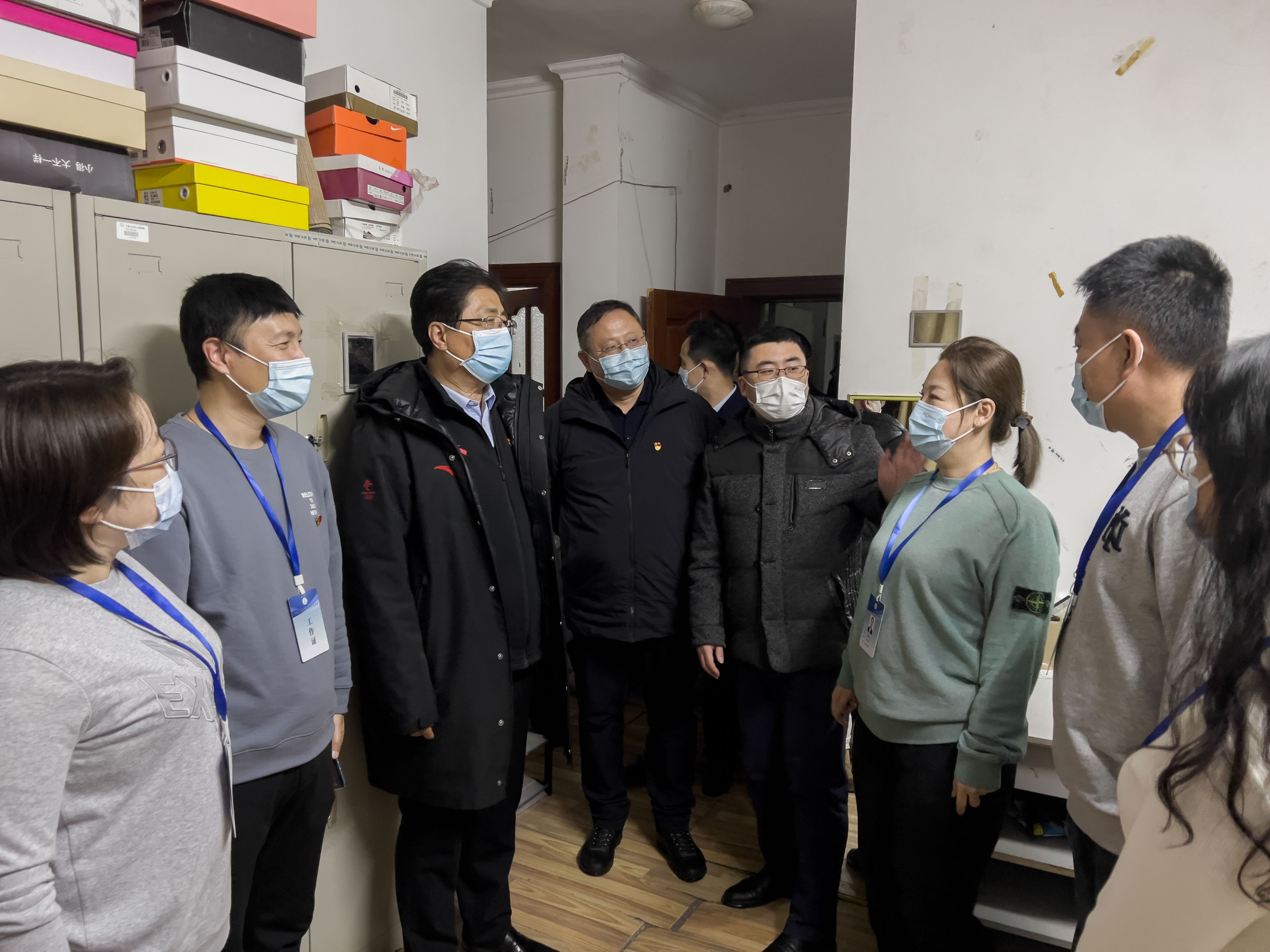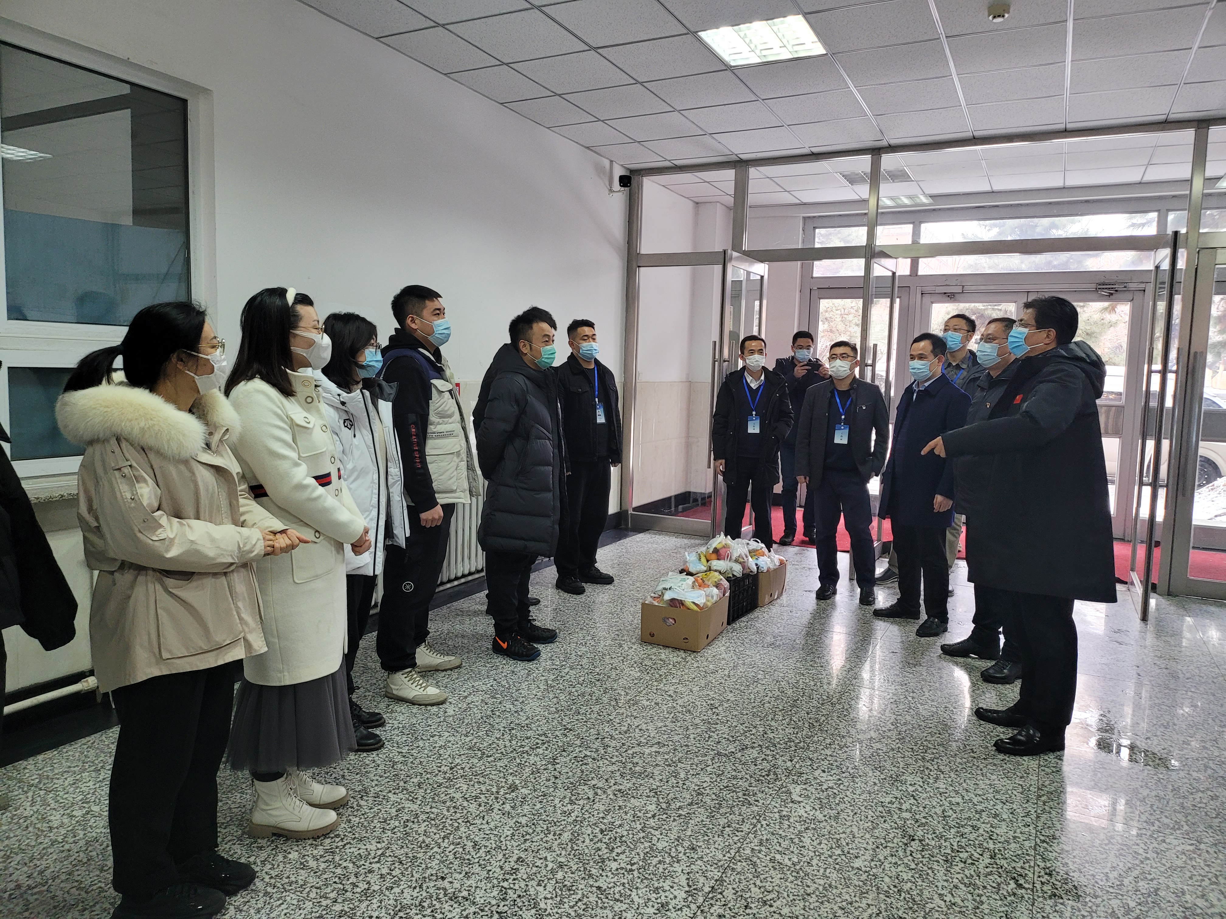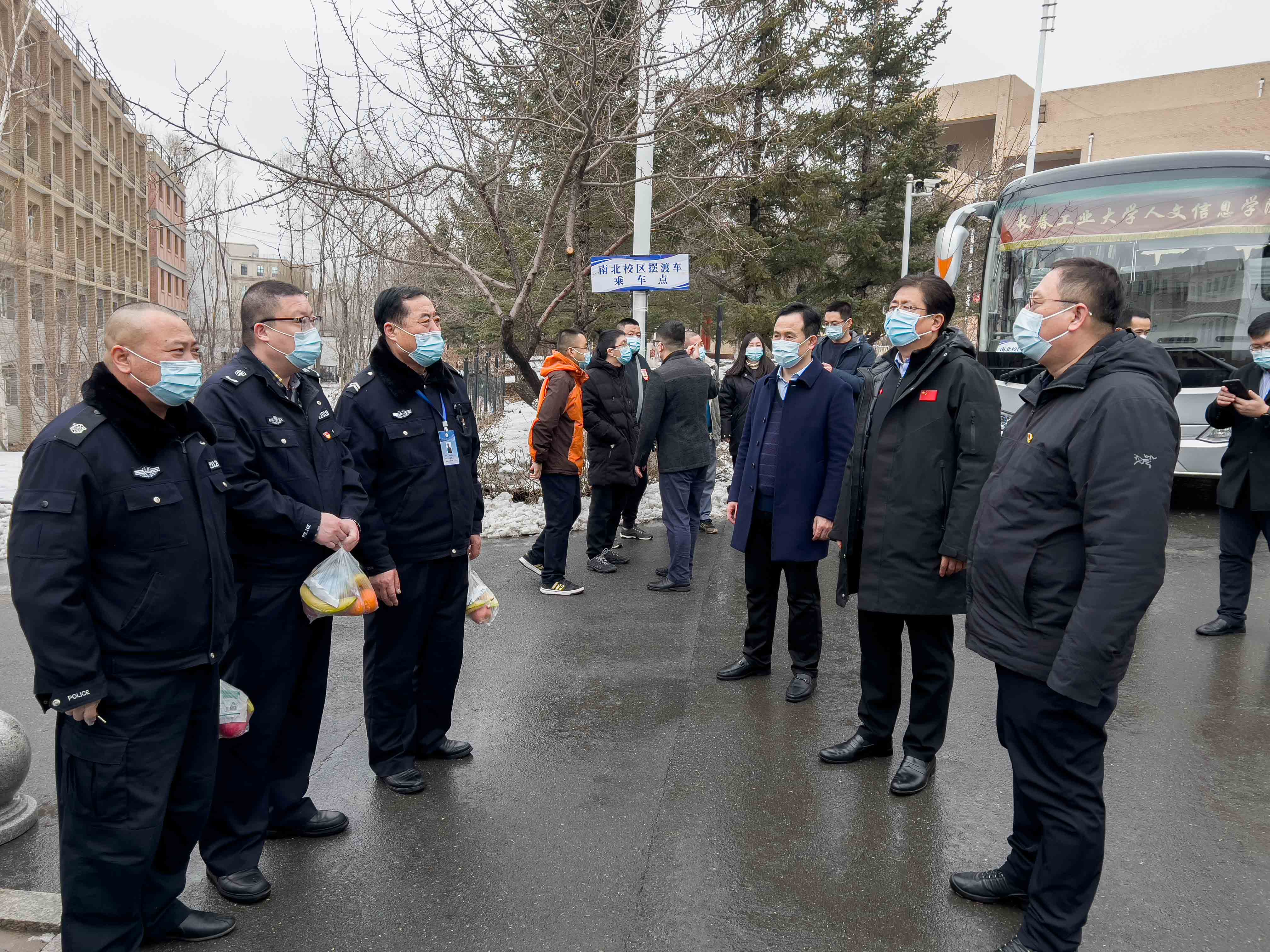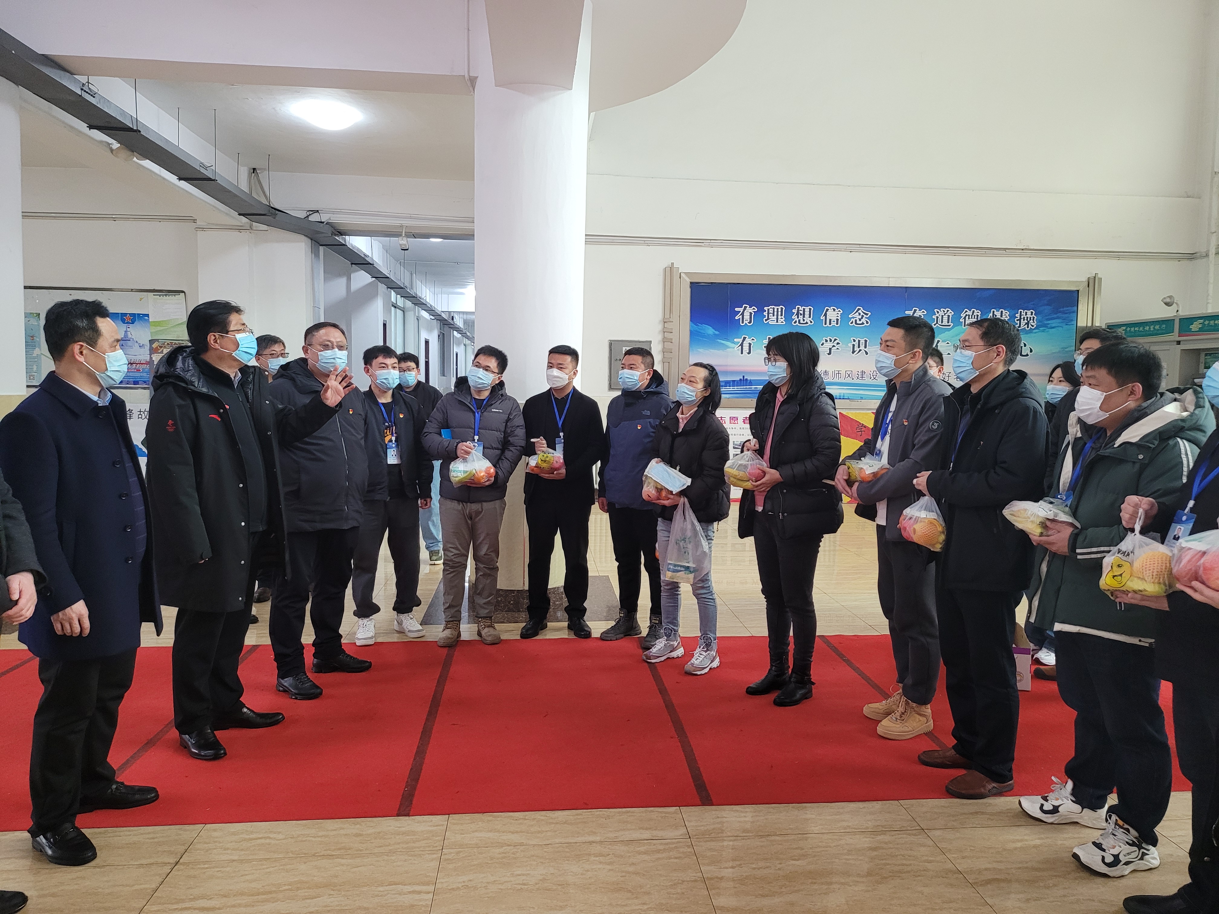 校领导一行先后来到行政办公楼,第一、第二、第三、第四教学楼,南、北校区值岗亭和宿舍,看望慰问正在一线值守的辅导员、行政人员、后勤保障人员和安保人员,并给每人送上慰问信、水果和医用口罩等防护物资。
