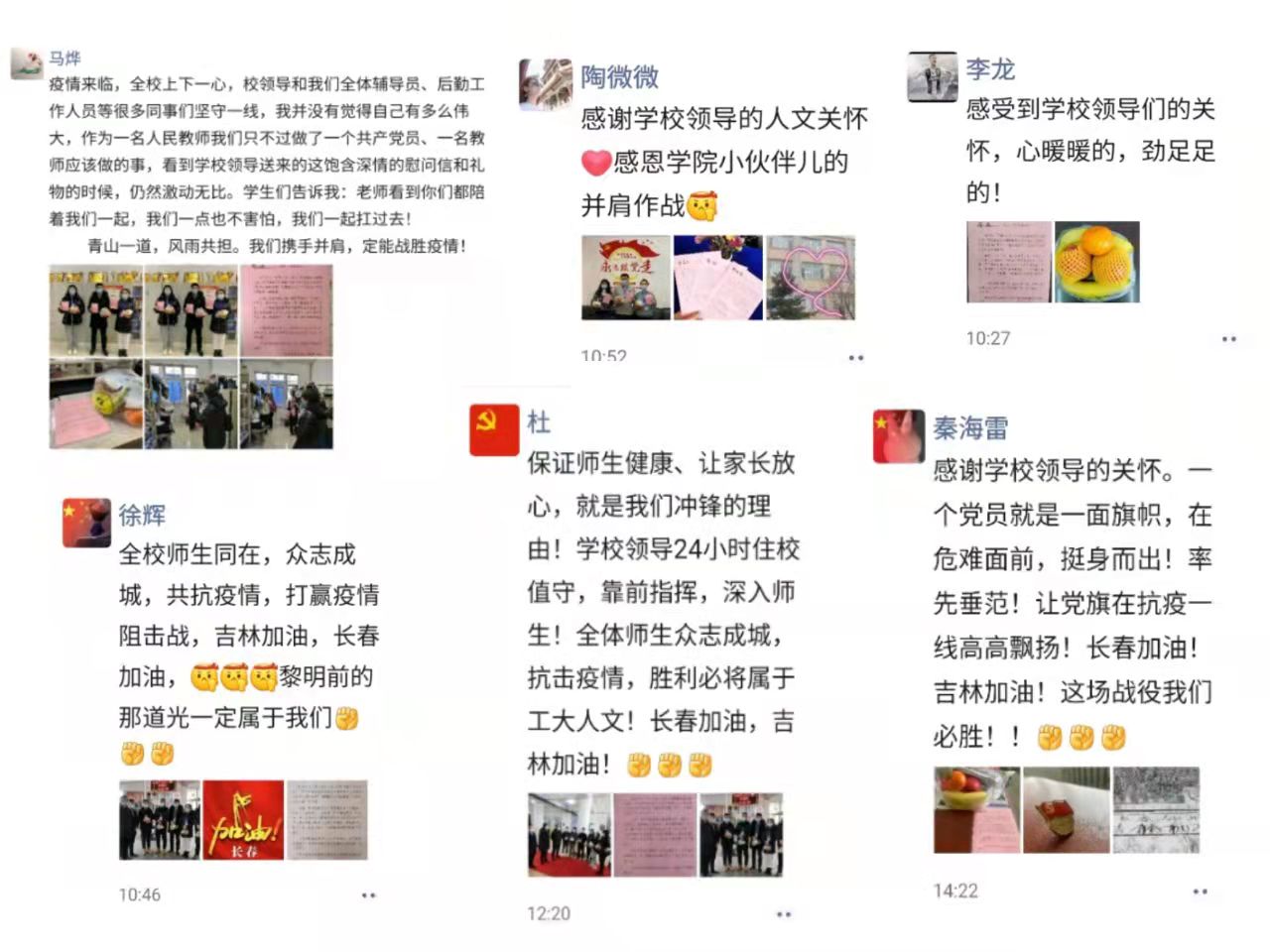 学校疫情防控一线的教职工纷纷表示,感谢校领导的关心与慰问,一定会坚守岗位,坚定信心,扎实做好疫情防控各项工作,与全体师生一道,全力以赴打赢这场疫情防控战。