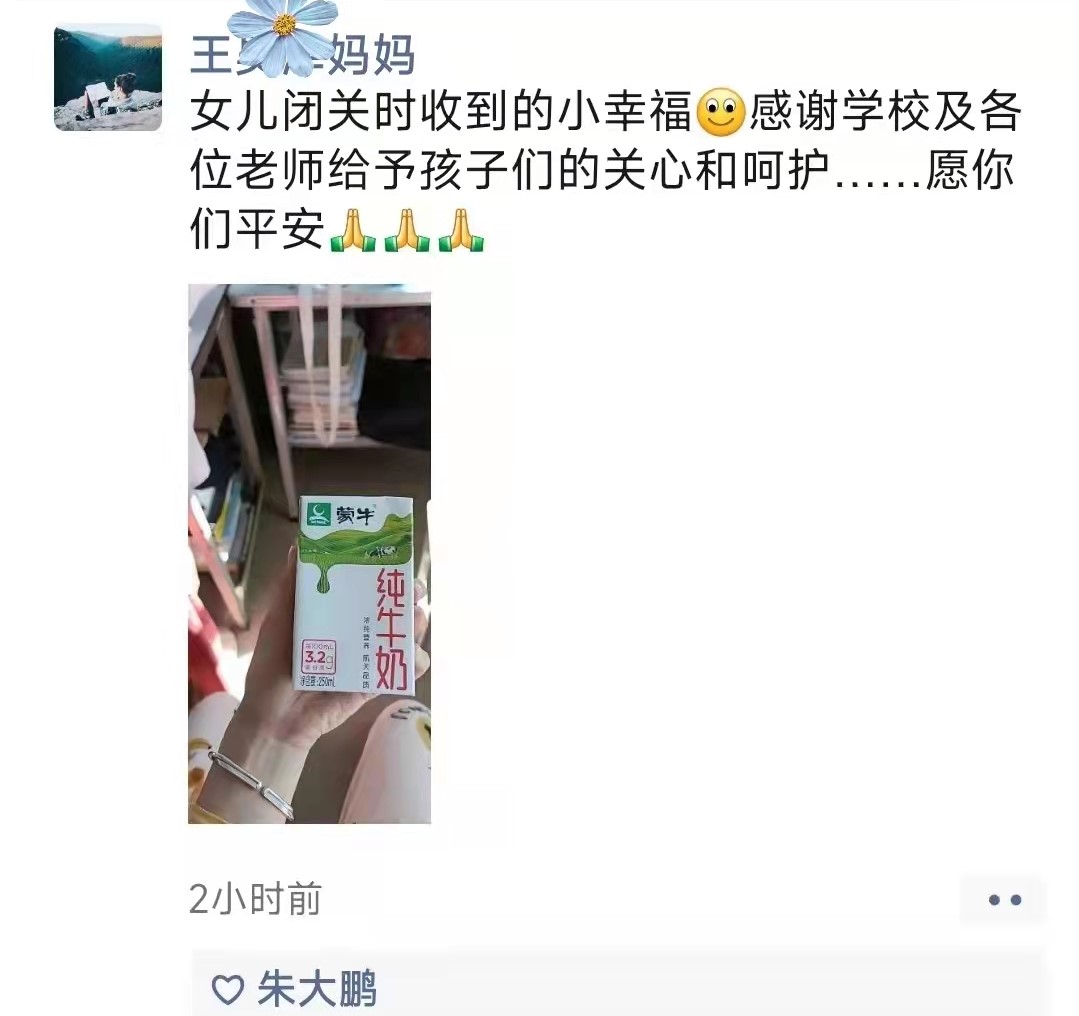“大疫无情人间有爱”,送去的虽然仅仅是一盒奶,但它体现了学校对全体坚守师生的关怀和惦念,更是学校全体师生战胜疫情的共同决心和信念。