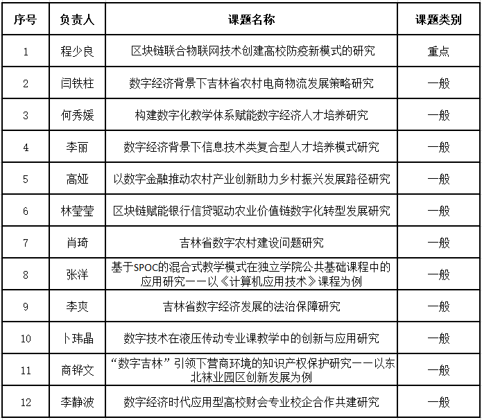 根据《关于申报2022年度吉林省数字经济学会数字经济与高质量发展研究项目的通知》要求,我校积极组织开展课题申报工作。本次共有15项课题申报,经校内初审修改后,全部推荐申报2022年度吉林省数字经济学会数字经济与高质量发展研究项目。经学会专家组评审,最终,我校共有12项课题获得批准立项,其中重点课题1项,一般课题11项,在此对成功立项教师表示祝贺。立项名单如下: