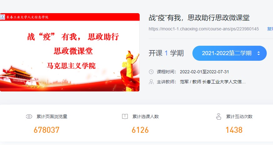 截至目前,长春工业大学人文信息学院马克思主义学院共为学生提供了24个专题,总时长3小时15分钟的战“疫”视频微课,马克思主义学院全体思政课教师,冲到抗疫一线,为引导学生自觉担负应有的社会责任,以积极乐观的心态来完成这次突如其来的疫情“大考”,为战胜疫情贡献出自己的力量!