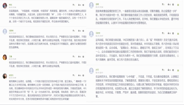 各分院学生积极参与收看,并展开了热烈讨论,纷纷留言分享收看后的心得。截至目前,学生累计选课6125人,页面浏览量总计达678035次,学生累计参与线上讨论1432人次。
