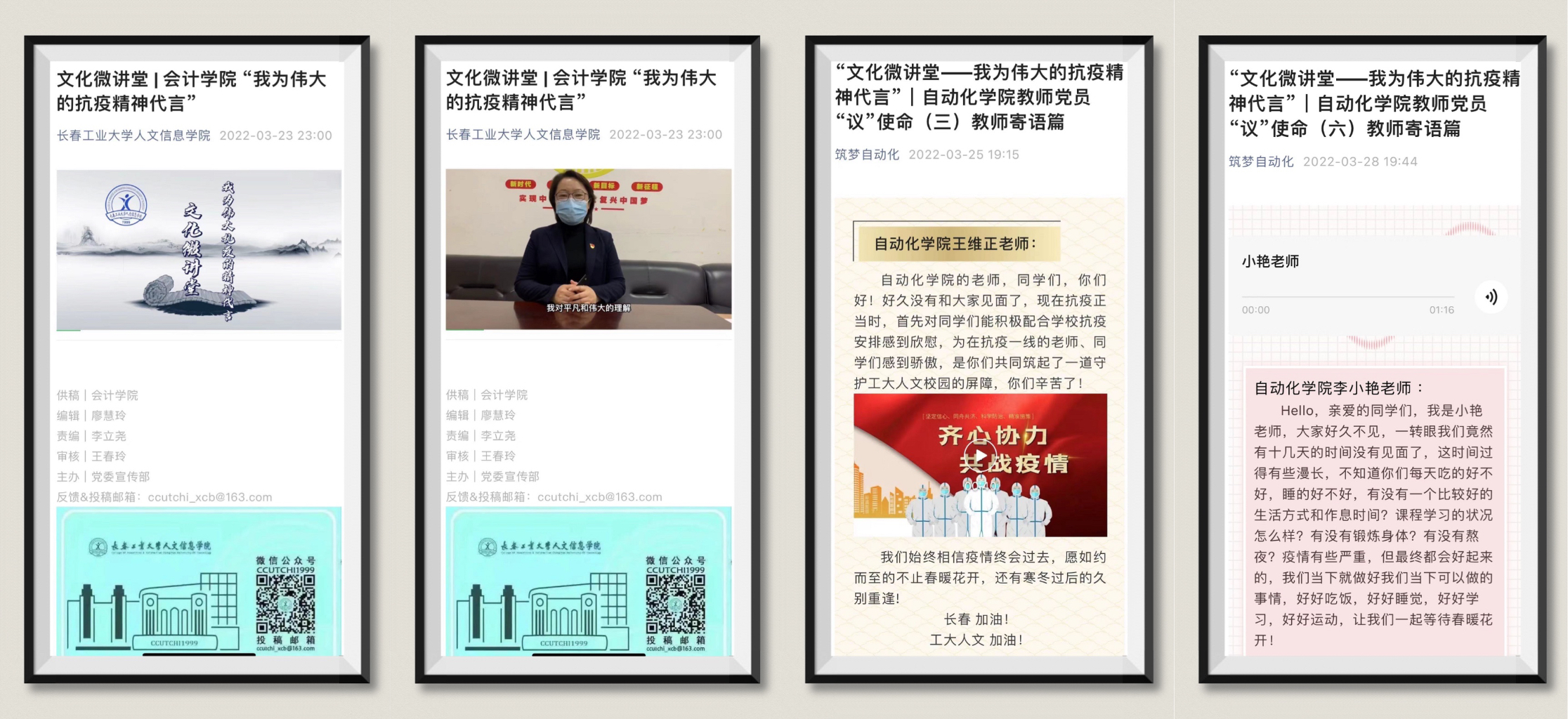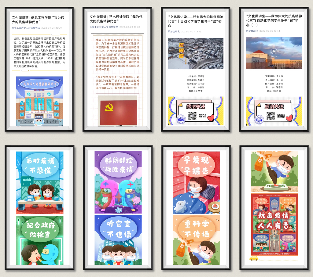 三月以来,长春工业大学人文信息学院紧紧围绕省市教育系统疫情防控工作部署和要求,全媒体开展新闻宣传和舆论引导,在做好校园网和新媒体新闻宣传的前提下,依托学校“文化讲堂”这一品牌,线上开展“文化微讲堂—我为伟大的抗疫精神代言”活动,讲好学校抗疫故事,学习、践行伟大的抗疫精神,引导广大师生正确认识疫情,强信心、暖人心、筑同心,不断凝聚起全校师生众志成城、共克时艰的强大正能量,为打赢疫情防控阻击战营造了浓厚舆论氛围。