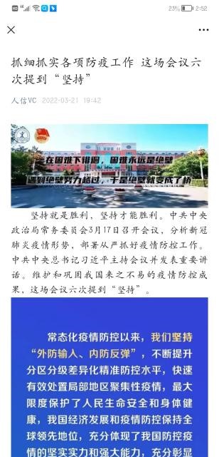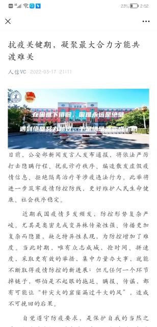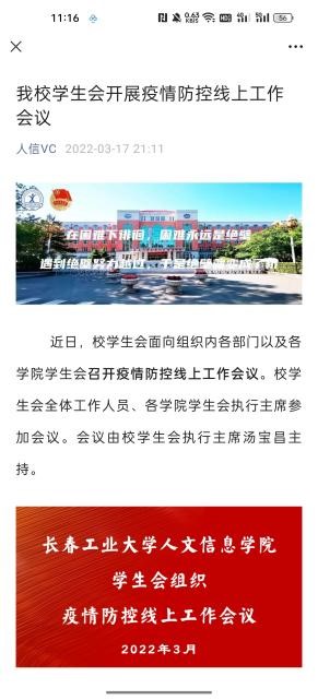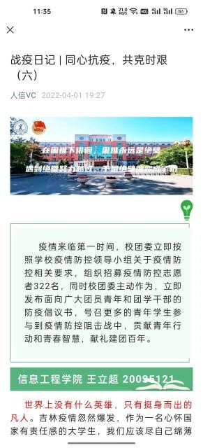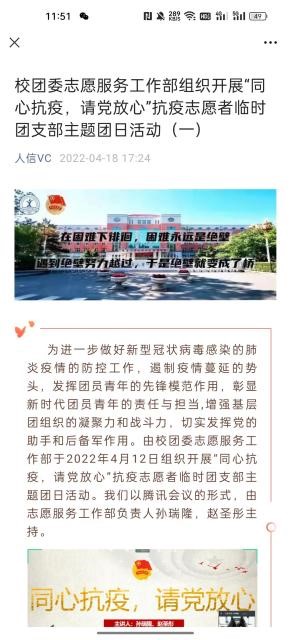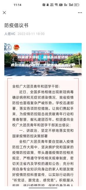 网上思想引导阵地筑牢。校团委充分发挥团学组织新媒体平台建设优势,将防疫知识学习,学校疫情防控工作精神,抗疫学生典型等作为重点宣传任务,将团员青年的思想引领做在网上,力争做到学生心里,凝聚共识、坚定信心。从3月10日至5月25日,校团委利用“人信VC”微信公众号累计发布宣传推文240篇,总阅读量达72565人次。发布“‘同心抗疫 共克时艰’学生志愿者战疫日记”推文6期,挖掘和报道先进典型事迹35篇,充分发挥先进典型的示范引领作用,形成众志成城、共克时艰的强大合力。