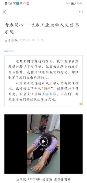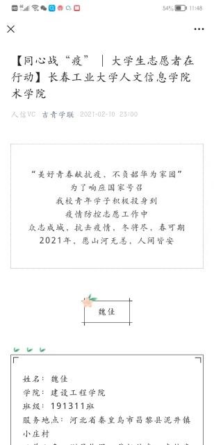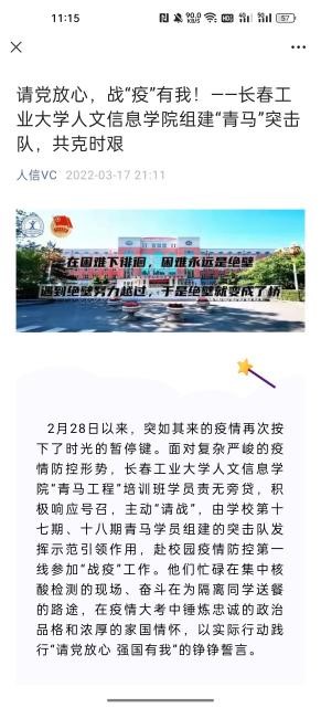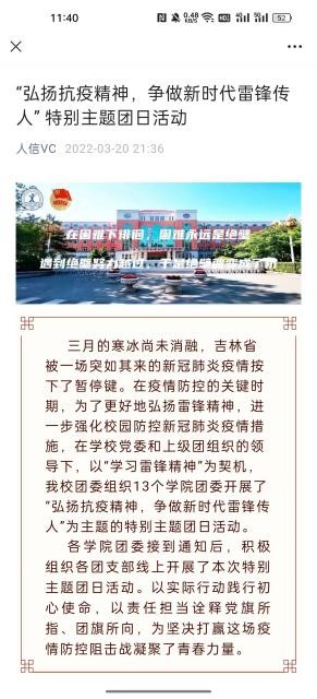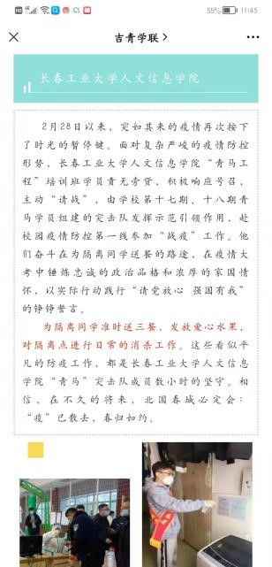 在此期间,我校成立“抗击疫情隔离点临时团支部”和“抗疫青年志愿者临时团支部”,并在疫情防控工作发挥着积极作用的做法被省教育工委简报刊载,志愿者的战疫日记被省高校网络思政工作中心宣传报道,我校青马突击队战疫纪实,青春同心--疫情下的寝室生活被团省委宣传报道,我校信息工程学院学生刘文斌创作的居家生活漫画在团省委吉青学联公众号公开发布。累计得到上级组织和部门的宣传报道十余次。