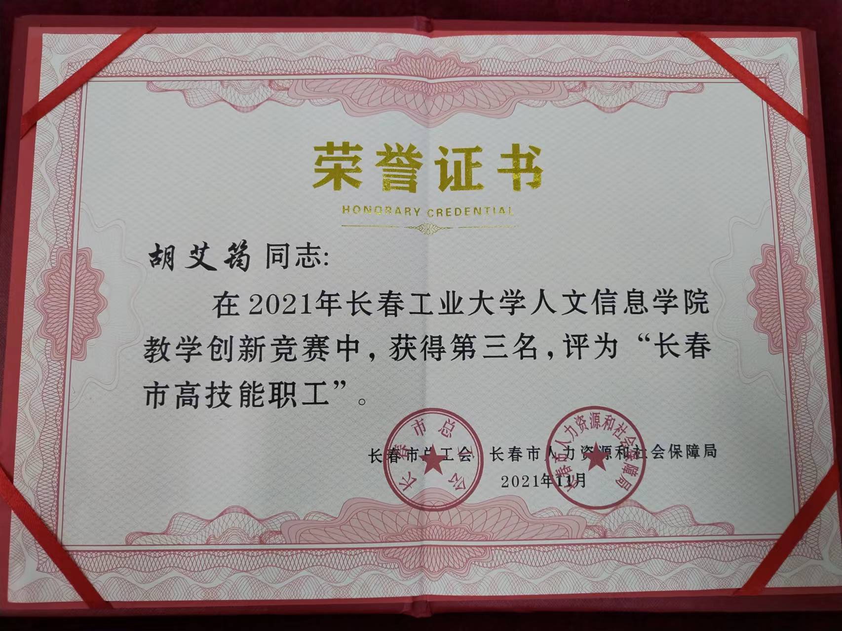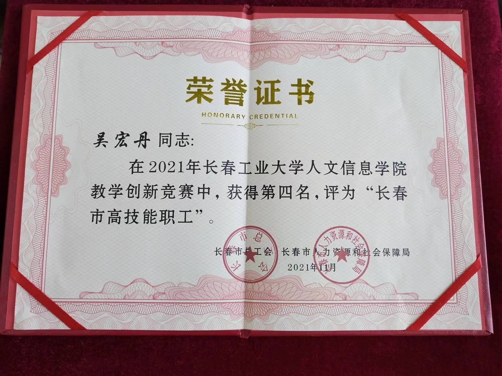 为贯彻长春市总工会、长春市人力资源和社会保障局联合印发的《长春市2021年职工技能大赛方案》精神,2021年6月学校正式启动教学创新大赛项目。本次教学创新大赛分初赛、决赛两个阶段。初赛由学校各教学单位负责组织,决赛由学校教务处牵头,教师教学发展中心、督学组、学校工会协同配合,于2021年7月落下帷幕。李佳慧、卜玮晶、胡艾筠、吴宏丹、高娅5名教师在比赛中脱颖而出,荣获长春市总工会、长春市人力资源和社会保障局“长春市高技能职工”。