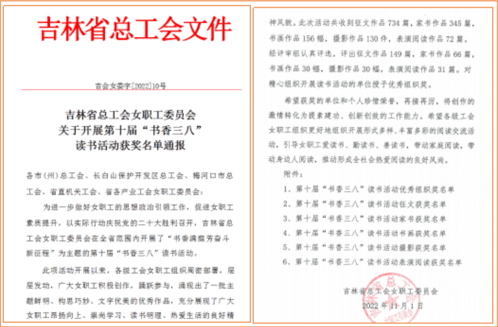 为进一步做好女职工的思想政治引领工作,促进女职工素质提升,以实际行动迎接党的二十大胜利召开,在吉林省总工会女职工委员会开展的“书香满庭芳 奋斗新征程”为主题的第十届“书香三八”读书活动中,我校工会选送的表演阅读类参赛作品《我和我的祖国》在众多参赛作品中脱颖而出,荣获二等奖。