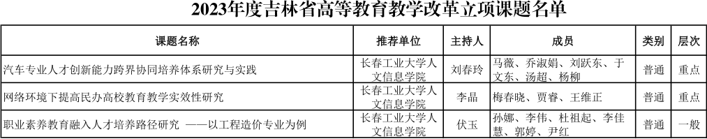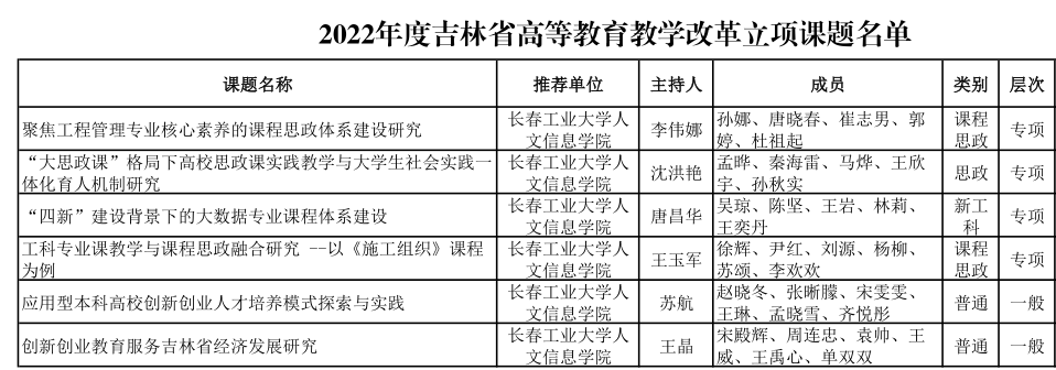 近日,吉林省教育厅公布了2022年度和2023年度吉林省本科高等教育教学改革立项课题名单,我校“聚焦工程管理专业核心素养的课程思政体系建设研究”等9个课题成功立项,其中2022年度课题6项、2023年度课题3项。从课题分类上,我校各类课题均有分布,其中课程思政专项课题2项、思政专项课题1项、新工科专项课题1项,教学改革重点课题2项、教学改革一般课题3项。