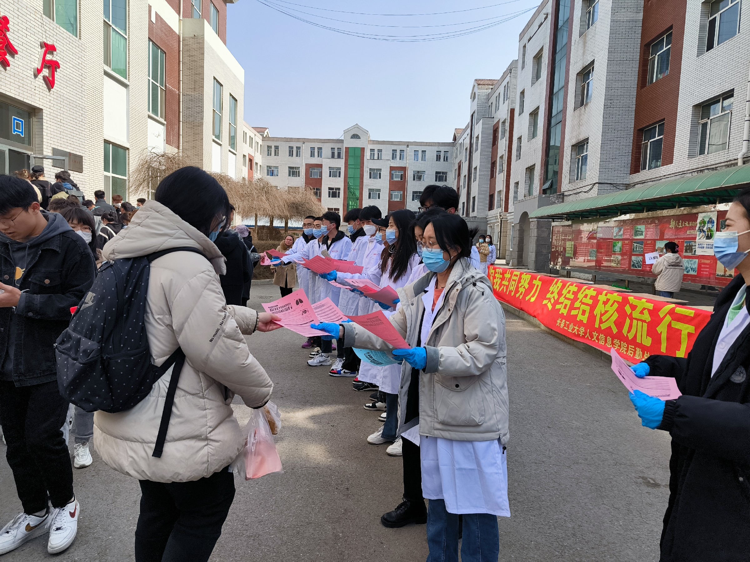 为纪念世界著名的德国科学家科赫氏发现结核菌,世界卫生组织(WHO)和国际防痨、肺病联合会(IUATLD)共同倡议,将3月24日作为“世界防治结核病日”。我校为进一步做好第28个“世界防治结核病日”主题宣传教育活动,宣传普及结核病防治知识,动员全校师生关心、支持和参与结核病防治工作,降低结核病发病率,后勤处联合长春市永兴街道卫生医疗服务中心、党委宣传部、校团委、制药工程学院,于2023年3月24日中午在食堂门前开展了以“你我共同努力 终结结核流行”为主题的宣传教育活动。