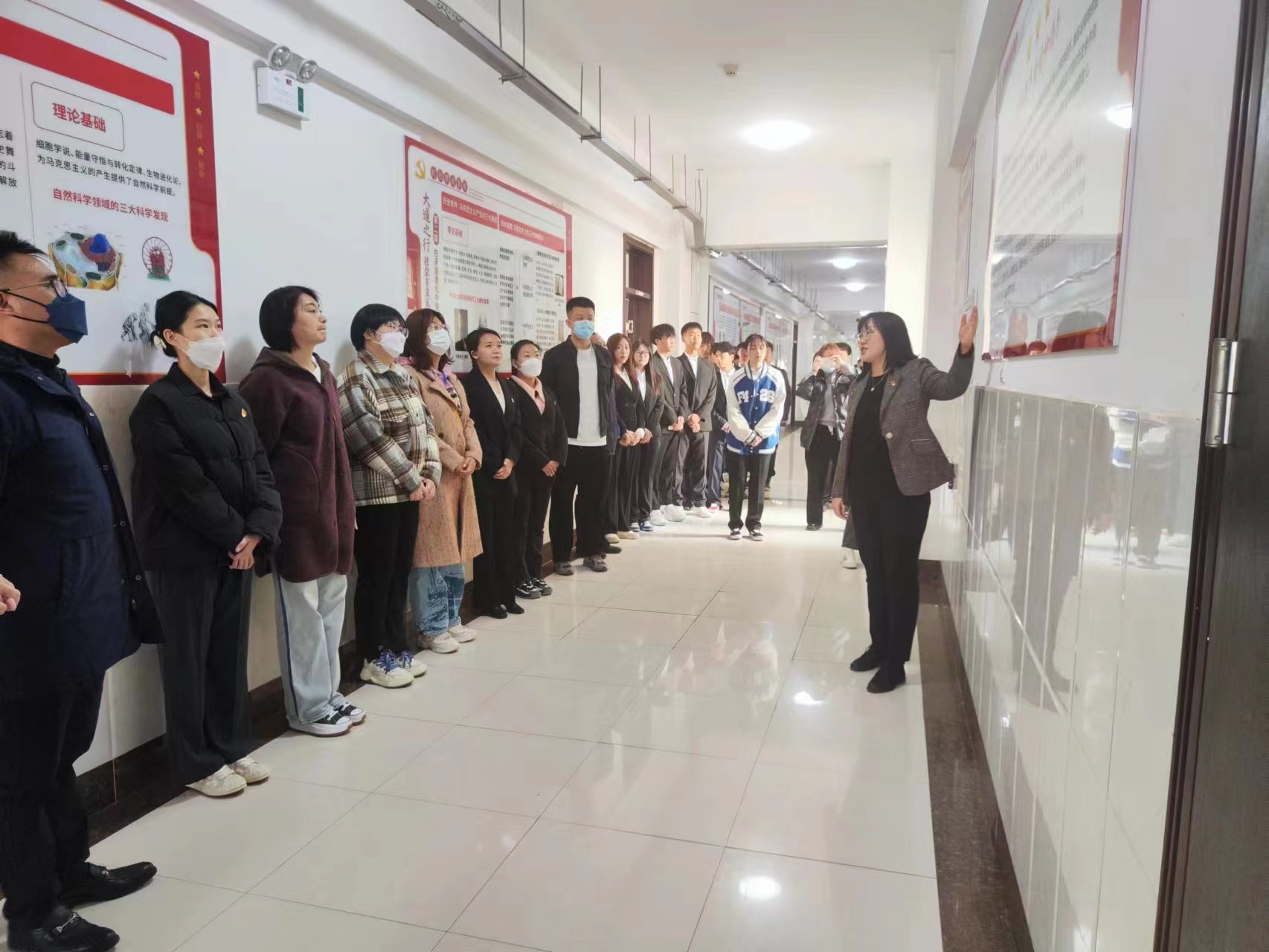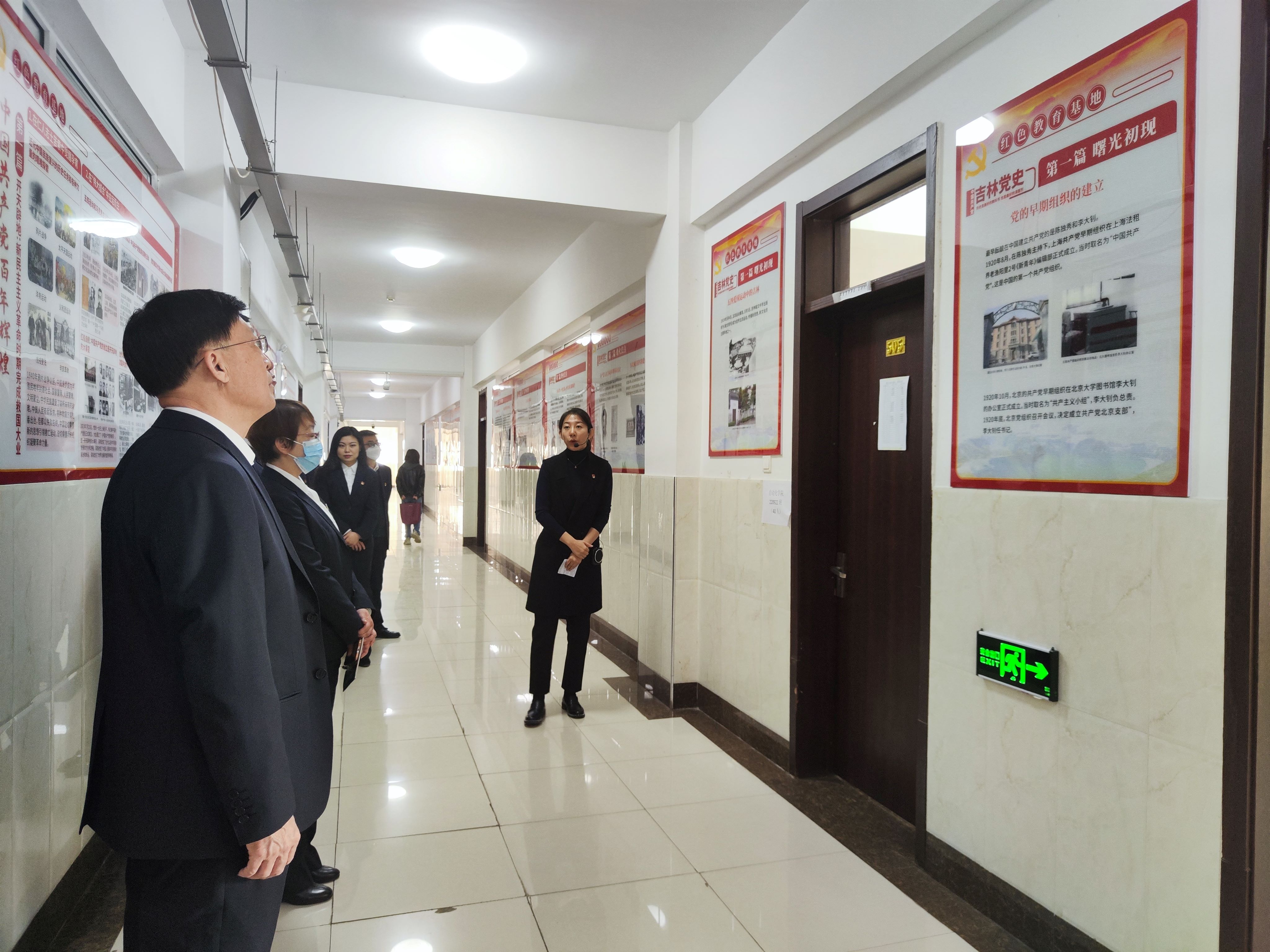 走进第三教学楼五层,一股浓郁的红色“气息”迎面而来:以走廊最北端“习近平新时代中国特色社会主义思想研究中心”为起点向南延伸,东西两侧的墙体分别被“大道之行:社会主义五百年回眸”“中国共产党百年辉煌”“中国共产党精神谱系”“吉林党史”四个部分的红色教育展板所覆盖,全展设置48块版面,总长98米,载有文字史料三万五千余字,图片400余幅。红色教育基地的内容既有理论深度,也有情感温度,用透彻的理论分析和客观的历史现实画面,展现出马克思主义的理论和实践魅力;在由伟大建党精神开启、涵盖党在百年非凡奋斗历程中孕育形成的共产党人精神谱系中,感悟红色精神伟力;通过全方位、全过程地宣传展示我们党一百年来为人民谋幸福、为中华民族谋复兴的波澜壮阔的奋斗历程,准确把握党百年奋斗的“四个历史时期”和取得的“四个伟大成就”;依托对吉林本土红色优势资源的挖掘与宣传,激发青年学生热爱家乡,扎根家乡,为推动吉林全面振兴做出青春贡献。红色教育基地继承发扬了学校德育为先的特色,与校史馆和图书馆相呼应,共同搭建起立德树人、铸魂培根的育人架构,架起新的育人廊桥,有效增强了红色教育的吸引力和感染力,使红色教育更接地气,更聚人心,浓厚了氛围,亮明了社会主义大学的鲜明底色。