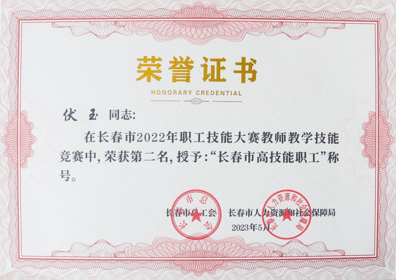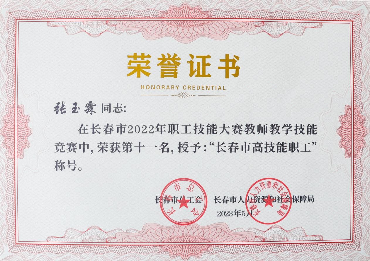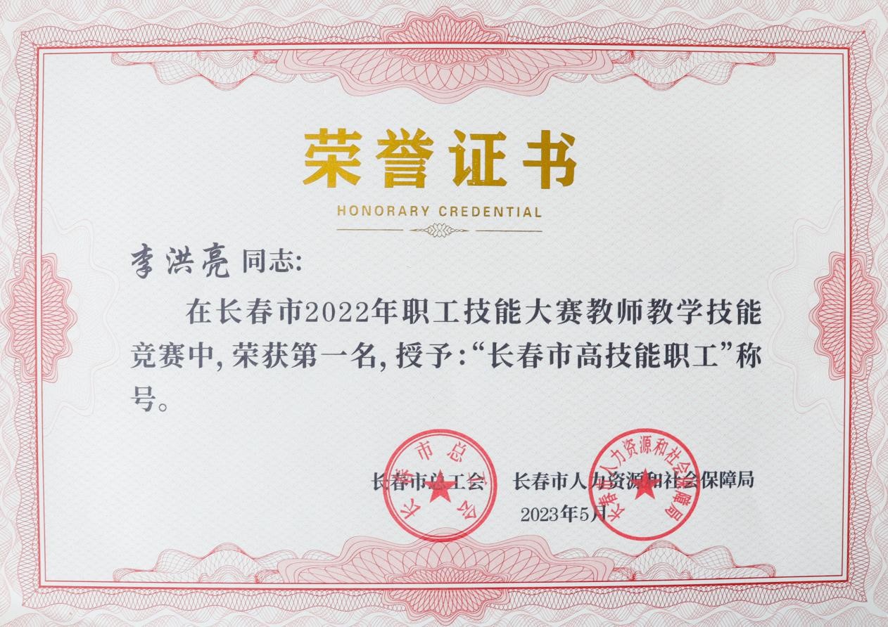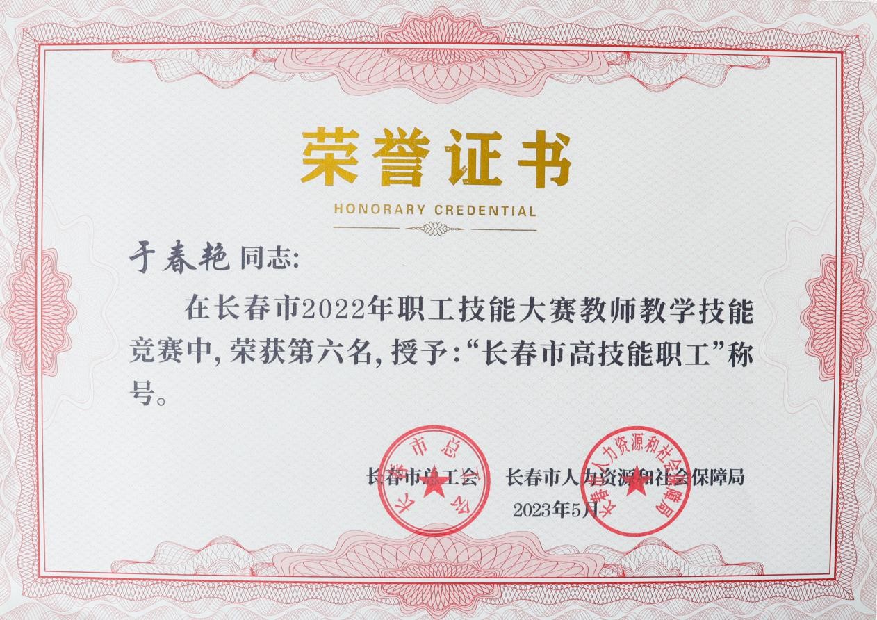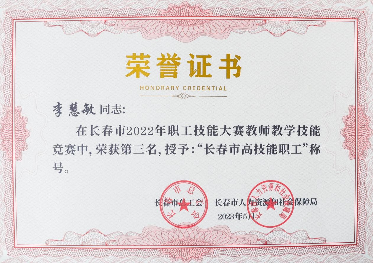 近日,长春市总工会、长春市人力资源和社会保障局联合下发长会联字[2023]5号文件《关于长春市2022年职工技能大赛工作情况的通报》,我校李洪亮、伏玉、李慧敏、林莹莹、于晓慧、于春艳、杜祖起、何秀媛、高娅、聂新元、张玉霖荣获“长春市高技能职工”称号。