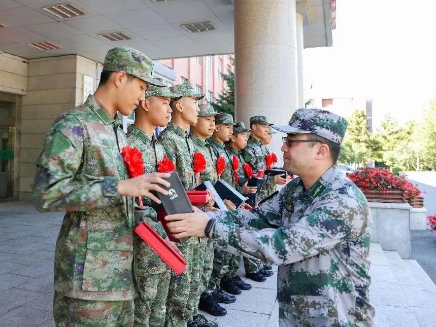 校党委副书记周丹同志、校武装部长庞旭同志分别为新兵颁发纪念品。