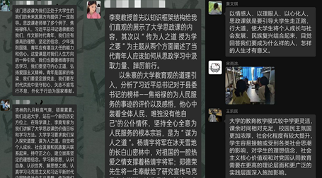 讲座结束之后,师生们展开了热烈的讨论,纷纷表示通过本次思政课导学课的学习,不仅进一步使同学们坚定了理想信念,引导大学生争做有理想、敢担当、能吃苦、肯奋斗的新时代好青年,同时也为我校思想政治教育工作以及学风建设工作奠定了坚实的基础。