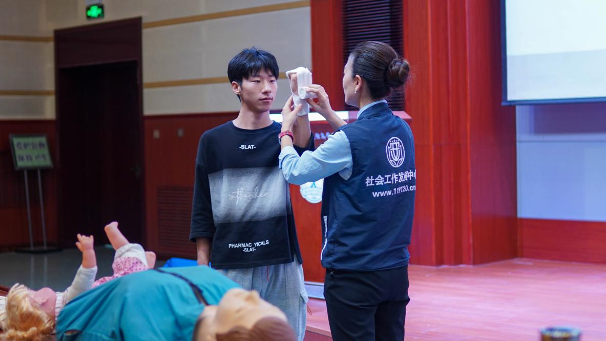 马钰铭主任的讲座有很强的理论指导性和现实针对性。急救方面重点讲解了日常急救知识、心肺复苏术(AED)除颤仪使用规范、胸外按压和人工呼吸的正确操作方式;包扎方面讲解了环形包扎法、“8”字型包扎法、螺旋包扎法的操作规程。现场邀请师生共同进行实际操作演练,使师生在理论上和实际操作上加深了对急救知识方面的了解,学会了自救与救助他人的方法、程序。