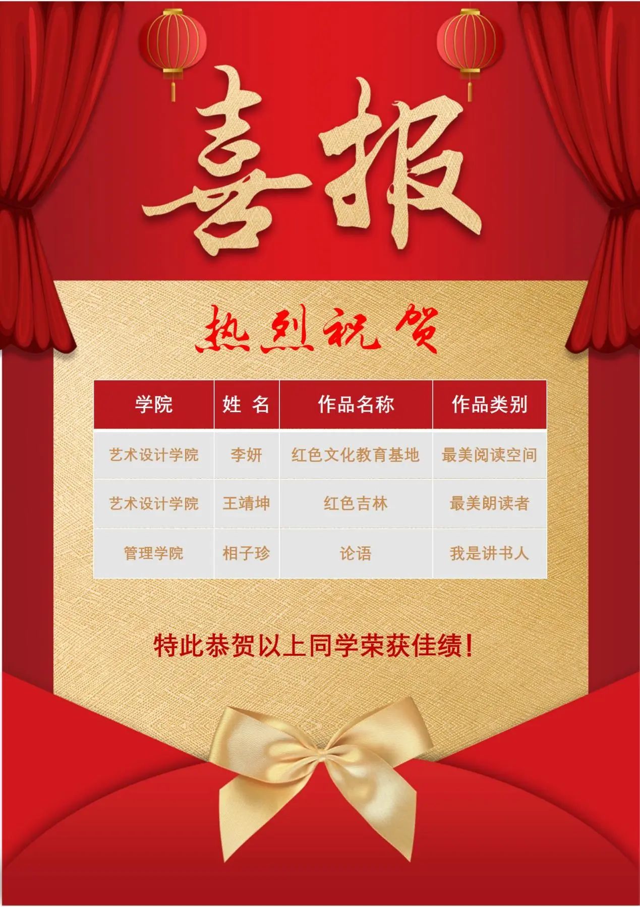 2023年4月至10月,吉林省教育厅组织全省高校大学生开展读书系列活动。活动期间共收到全省高校报送作品776个。经专家评审,确定“最美阅读空间”“最美朗读者”“我是讲书人”等系列活动一等奖各5个、二等奖各10个、三等奖各15个。自本活动启动以来,我校图书馆积极号召,读者协会成员广泛参与。在读者协会指导教师王方的组织下,经过孟丽丽老师的精心指导,张旭森、刘俊麟、赵怡鹏老师的全程录制和后期剪辑,我校报送的李妍、王靖坤、相子珍三位同学的作品均获得二等奖。