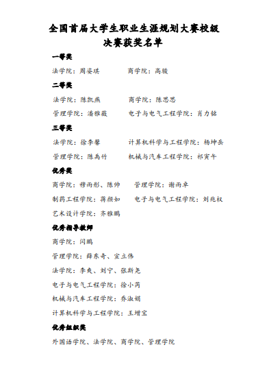 经过激烈角逐,最终法学院的周姿琪、商学院的高骏荣获大赛一等奖;管理学院潘雅薇等4名同学荣获二等奖;机械与汽车工程学院祁寅午等4名同学荣获三等奖。制药工程学院蒋颜如等6名同学荣获优秀奖。外国语学院、法学院、商学院、管理学院荣获优秀组织奖。法学院李爽等9名指导教师荣获优秀指导教师。
