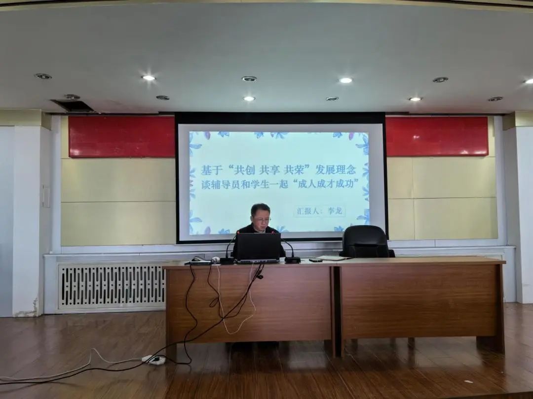 艺术设计学院党总支书记李龙以《基于“共创 共享 共荣”发展理念,谈辅导员和学生一起“成人成才成功”》为题,从对学校的发展理念和校训的理解切入主题,介绍了学校“共创、共享、共荣”的发展理念、“三成”教育等内容。指出辅导员应该从职业走向事业,培养勤于思考、善于总结、敢于实践的工作作风和个人成长大局观,并指导了学生层面的“三成”教育和培养的具体工作办法。