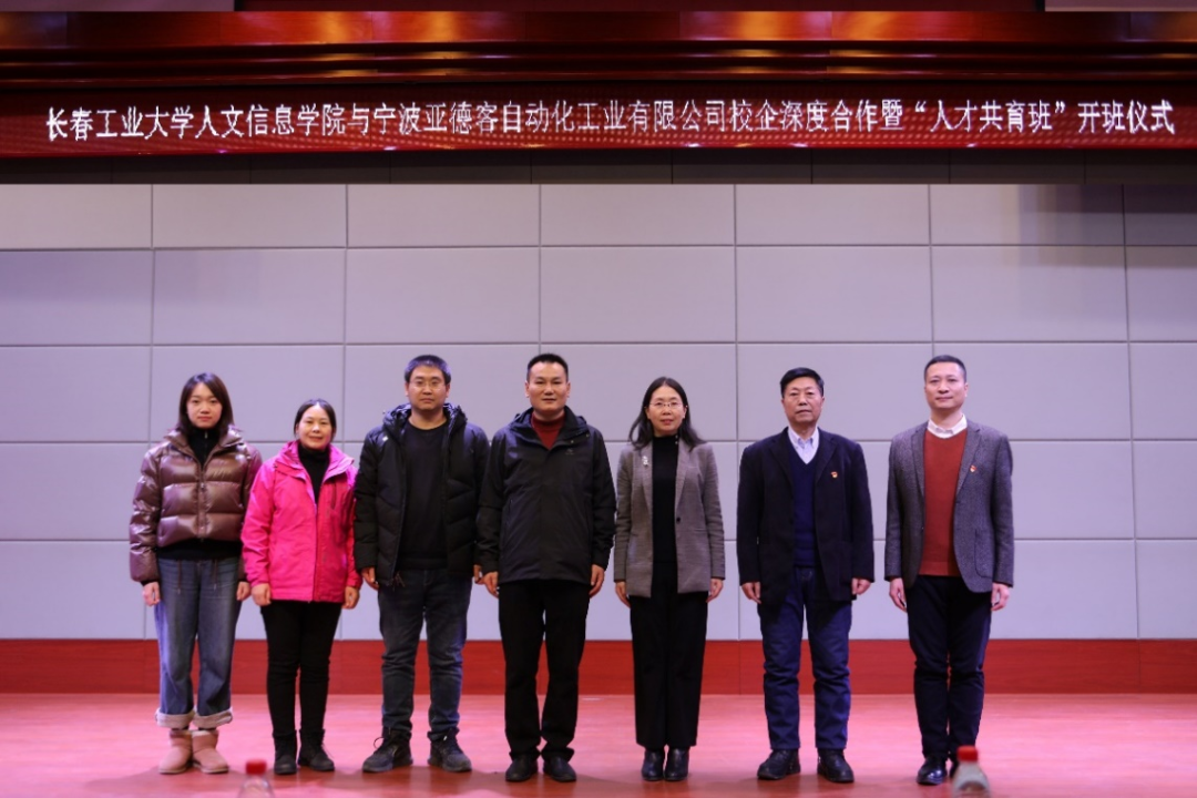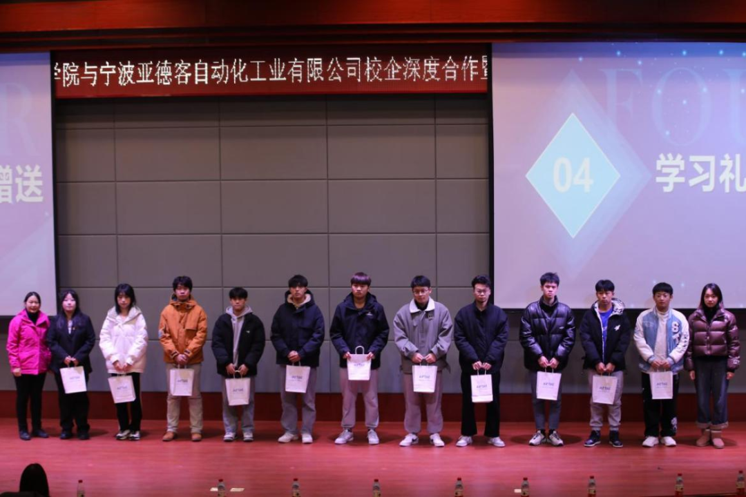 为加强校企合作、深化产教融合,创新人才培养模式,深入落实人才共育目标,2023年12月13日,宁波亚德客自动化工业有限公司与我校于学校学术报告厅举行了校企深度合作暨“人才共育班”开班仪式,宁波亚德客自动化工业有限公司行政部经理陆宗军,人事科高级专员荀桂花,管理处专员林芳竹出席仪式,学校副校长臧玉萍,机械与汽车工程学院院长毛志阳,副院长刘跃东以及学院师生代表参加,学院党总支书记秦海雷主持。