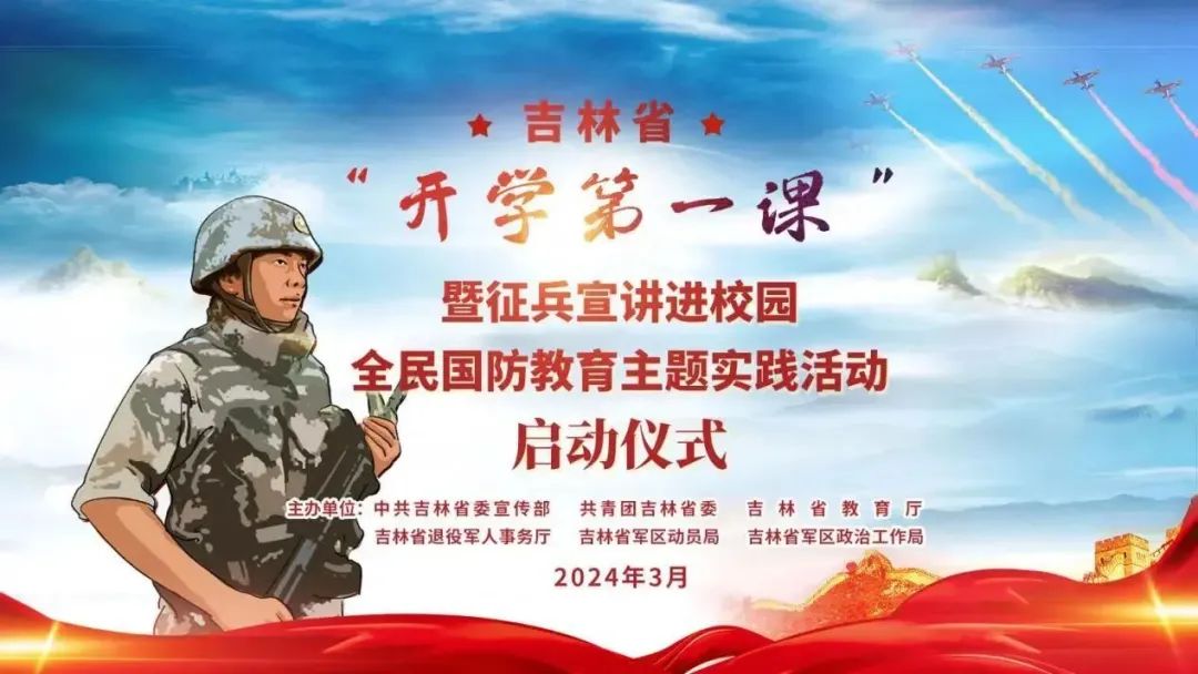 为深入学习贯彻习近平强军思想和习近平总书记关于加强全民国防教育的重要论述,为了进一步加强国防意识,弘扬爱国主义精神,增强全民国防观念,让“关心国防、热爱国防、建设国防”的全民国防意识进一步深入师生心中,吉林省“开学第一课”暨征兵宣讲进校园全民国防教育主题实践活动启动仪式于3月7日13:30举行。