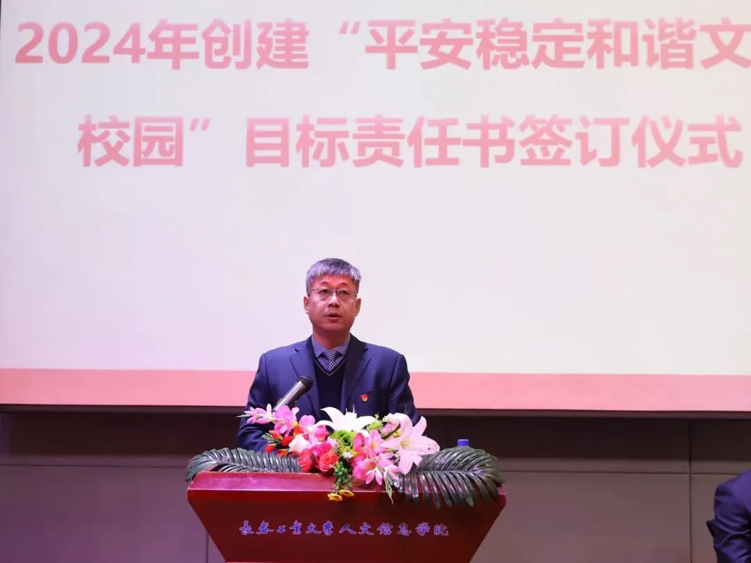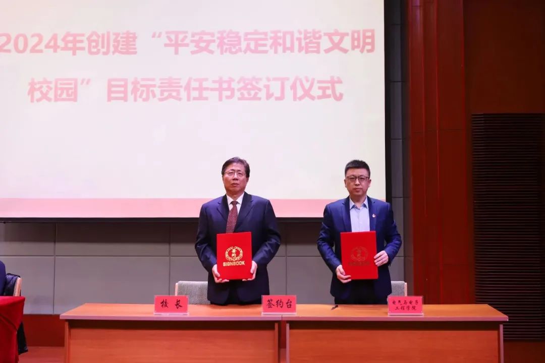 仪式现场,校长潘福林代表学校与图书馆、电气与电子工程学院分别签订2024年创建“平安稳定和谐文明校园”目标责任书。