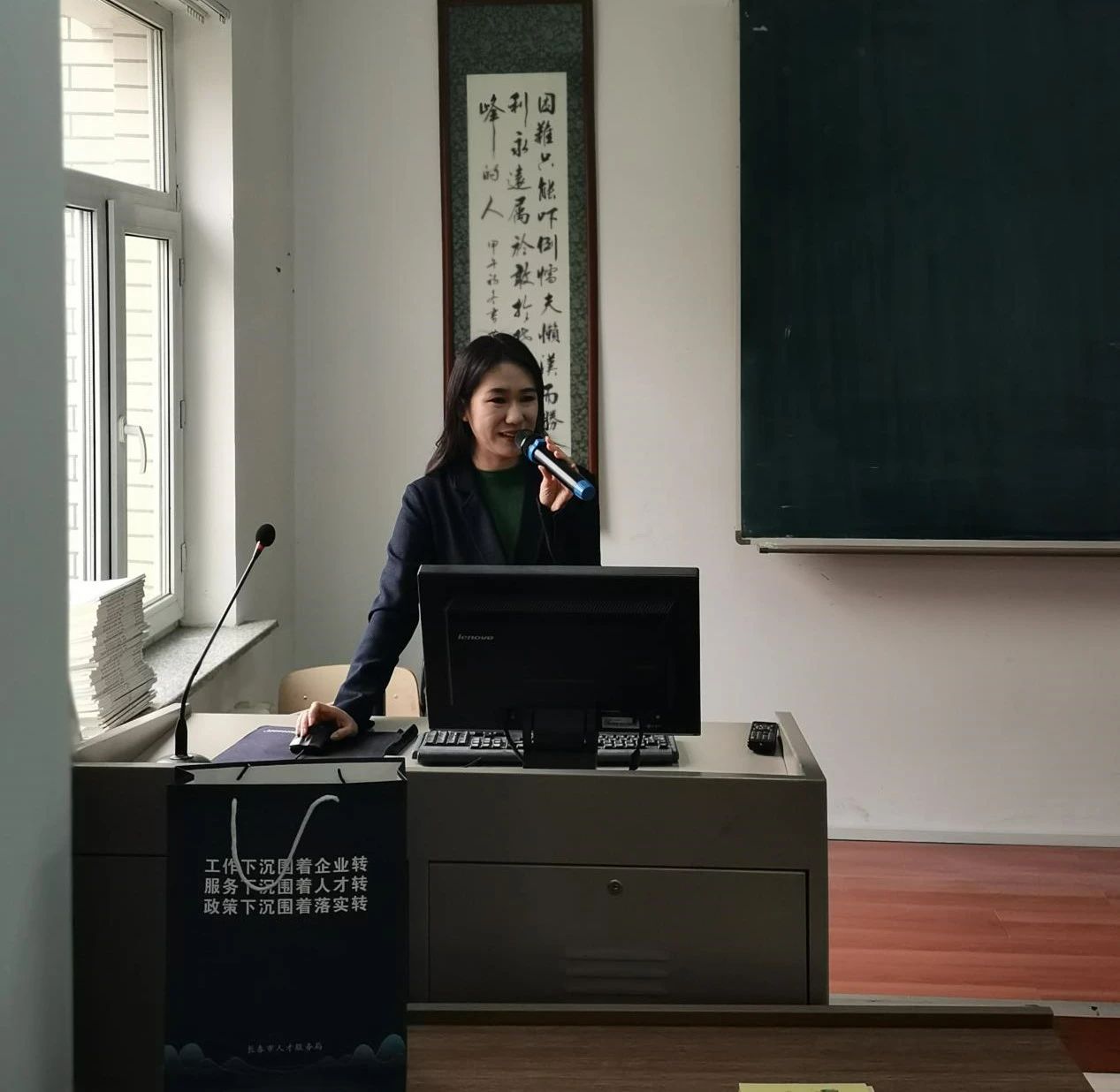 李赫结合长春市历史人文、宜居环境等城市特征,讲解长春市近两年来经济发展的良好态势,从生活、住房、安家落户、就业创业四大方面深入解读青年人才政策,为学校毕业生提供实用性强、个性化足的就业指导服务。