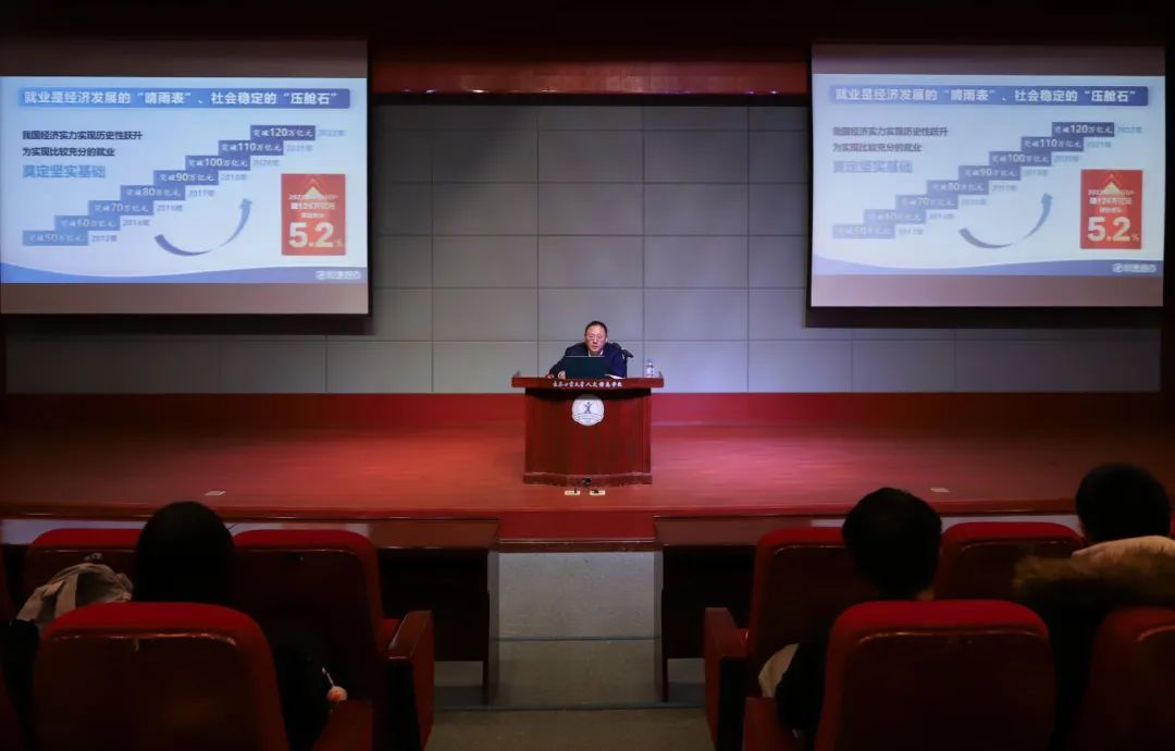 王煊从总体就业形势、就业面临的压力、就业优先战略、拓宽渠道等方面全方位多角度深入解读。他强调,就业是最大的民生,关系家庭幸福、社会稳定。随着就业规模的不断扩大,就业体系和结构的持续优化,就业形势整体向好,青年学生要坚定信心。同时也应清醒地认识到,我国巨大的人口体量和大量青年毕业生因社会和家庭因素导致的“缓就业”“慢就业”等问题,就业质量存在较大落差。他以自身成长经历为切入口,从同学们现实关切出发,引用最新详实的数据,分享民营企业招工的实例,比如外卖跑单王的案例,网约车司机的窘境,chatGPT的兴起等等,用一个个生动的案例深入剖析现如今就业的复杂形势,同时也让同学们了解到与大学生息息相关的就业优先政策,以及学校的相关政策,引导学生树立正确的择业观。