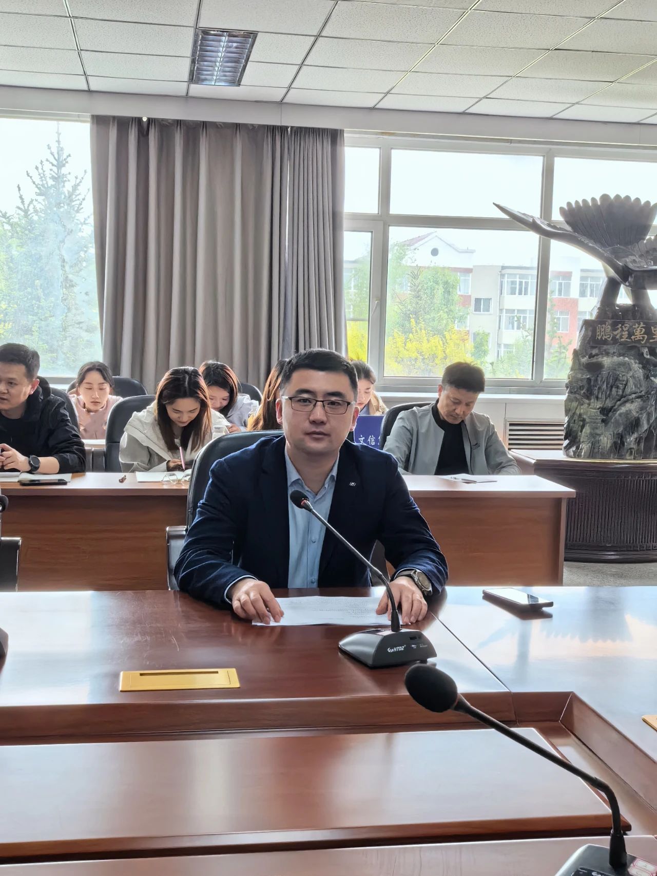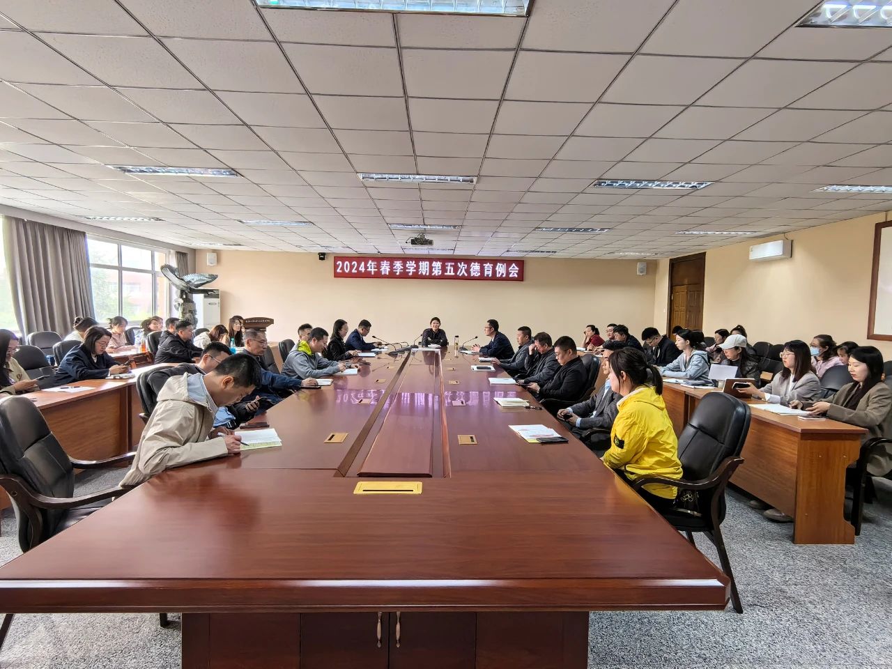 庞旭对“五一”假期返校情况、行为文明检查情况、2024年春季献血工作、2025届预毕业生资格审查工作、安全教育专题月中宿舍安全检查情况、4月份易班开展情况、一站式风采展示平台等工作进行通报;对2024年早操、重修考试诚信教育工作等提出相关要求;对心理健康教育各项工作、5月份易班开展工作、2024届毕业生工作、安全管理工作及日常管理等工作进行部署。