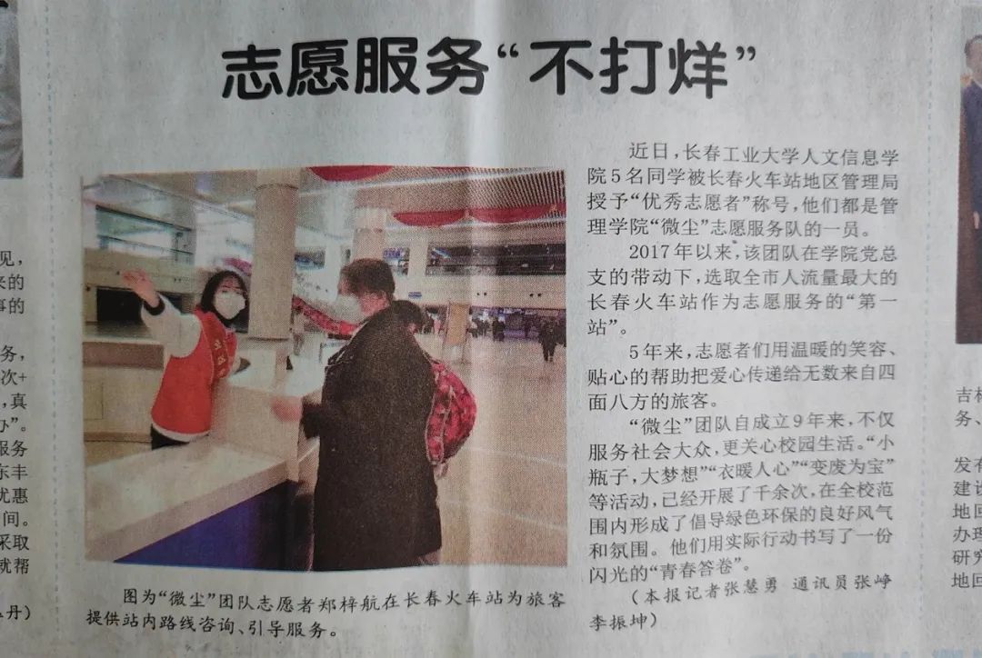 多年以来,管理学院一直引导学生积极投身志愿服务事业。微尘VC团队自2009年成立以来,一直致力于服务社会。微尘VC团队曾获得“2017年度火车站地区青年志愿服务突出贡献奖”、团队多名成员曾获得“优秀志愿者”称号,团队的事迹曾被《吉林日报》报道。