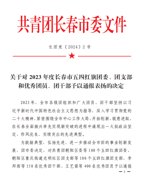 近日,共青团长春市委发布了《关于对2023年度长春市五四红旗团委、团支部和优秀团员、团干部予以通报表扬的决定》。长春工业大学人文信息学院团委荣获“2023年度长春市五四红旗团委”。