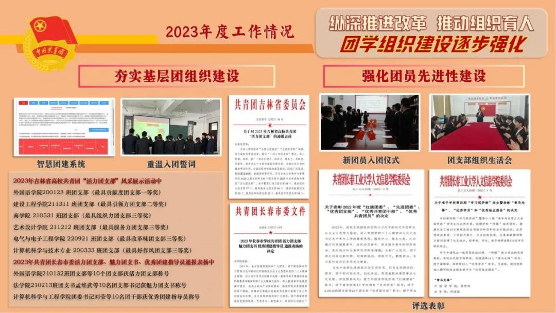 二是夯实基层团组织建设。严格落实“班团一体化运行”制度,强化“智慧团建”平台,推进基础团务网络化和规范化建设。在省级“活力团支部”风采展示活动中,我校1个支部获评一等奖、1个支部获评二等奖,4个支部分获三等奖。2023年7月,校团委书记孟晔作为高校代表与吉林大学、长春中医药大学在团中央基层建设部来吉调研时,向齐虎部长做了工作汇报。