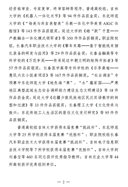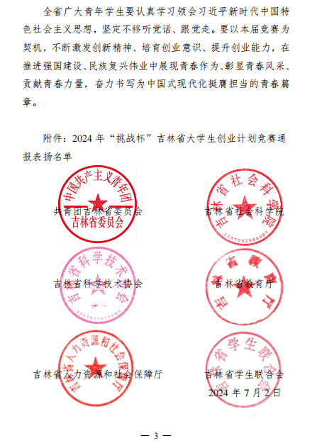 近日,共青团吉林省委员会、吉林省社会科学院、吉林省科学技术协会、吉林省教育厅、吉林省人力资源和社会保障厅、吉林省学生联合会共同发布了《关于开展 2024 年“挑战杯”吉林省大学生创业计划竞赛通报表扬工作的通知》,我校荣获普通高校组金奖1项,银奖2项,铜奖14项;社会调查专项赛金奖1项,银奖1项,铜奖7项;4位指导老师获评“优秀指导教师”。学校捧得吉林省“优胜杯”并获评“优秀组织单位”。我校入围省赛决赛作品数量、获奖数量与等级、优秀指导教师获评数量均取得历史突破。